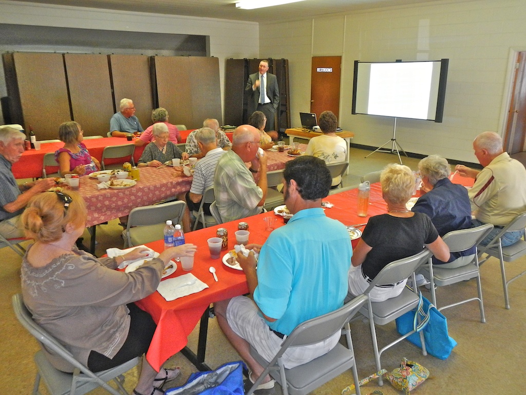 The CMS Club had a Spring Potluck Dinner on Friday, April 24th. CMS members got together and brought a side dish to compliment the delicious barbecue, with sundries, supplied by Mr. Jeff Toadvine, a certified Financial Advisor and associate Vice President of Ameriprise Financial Services. Jeff gave a 20 minute presentation about the existing and ever changing public policy changes that can affect your retirement. In other words, “Expect the best, plan for the worst, and prepare to be surprised.” A few questions were asked of Jeff after the presentation and we are thankful for him sharing for we all at least learned something new. After dinner a few of us stayed to play shuffleboard under the lights. A good and informative time was had by all.