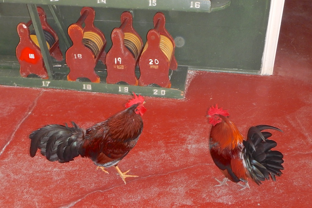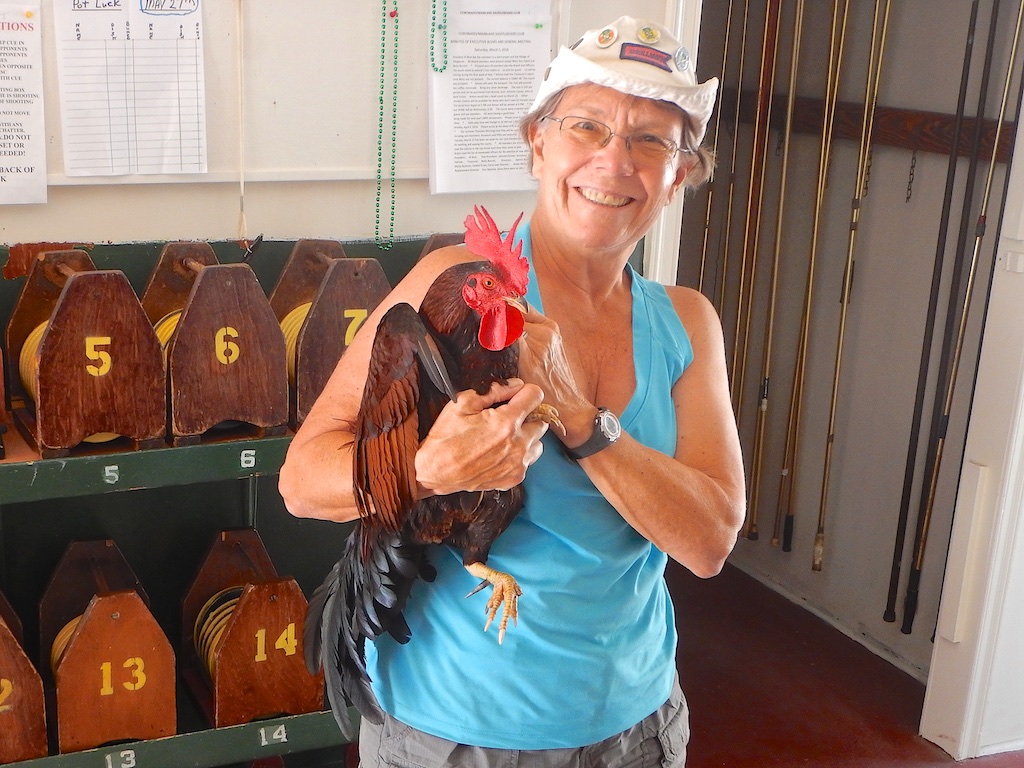 While we played shuffleboard on Sunday morning, our loudly crowing local free-ranging roosters strutted their stuff across the courts right into the clubhouse. They kind of reminded me of our four Pros (Charlie, Dennis, Pete”The Hammer” and Tom) who come by to play shuffleboard every Sunday morning. We might want to consider making the roosters our unofficial mascots because they sometimes imitate some of the CMS Club’s most enjoyable qualities in being spirited, carefree, boisterous and humorous.