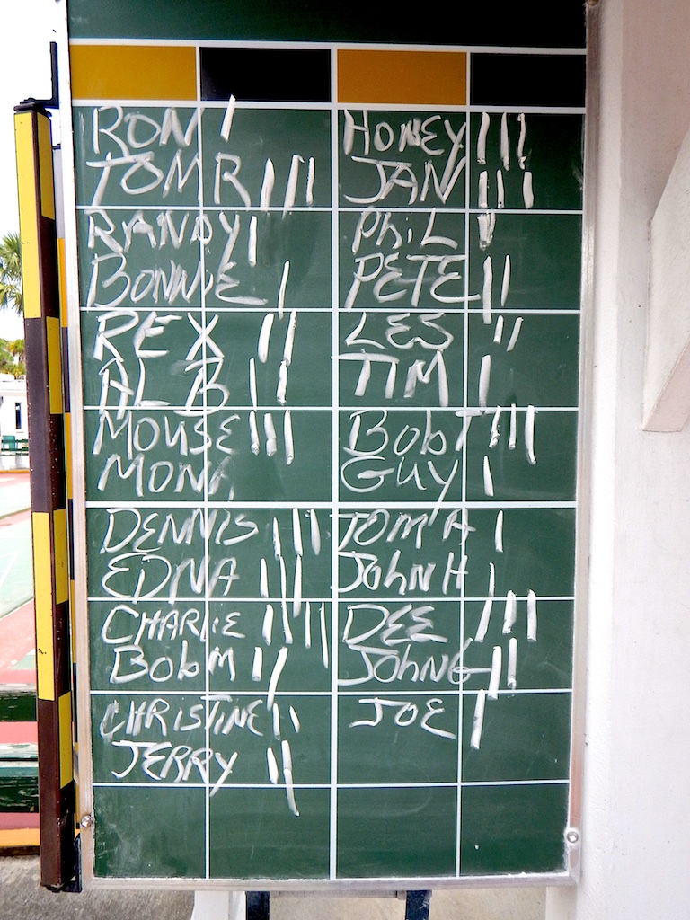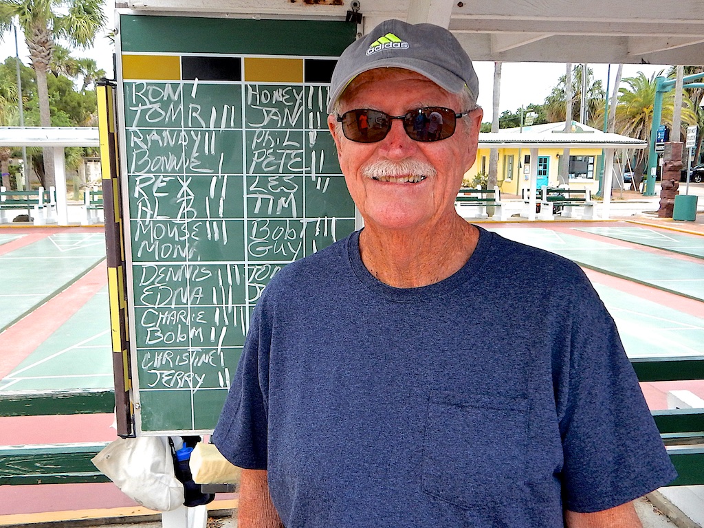 Ron Raymond and his helpers cleared the courts this morning and prepared them for play. Twenty-seven (27) avid shufflers showed up to challenge each other in their weekly matches. You get to play with and against any combination of Pros and Amateurs based on the luck of the draw. You also have an opportunity to gauge your own skills and learn from your fellow shufflers. Anyone has a chance to win! Today, Charlie Jones was the sole shuffler to win all four of his matches. Congratulations.