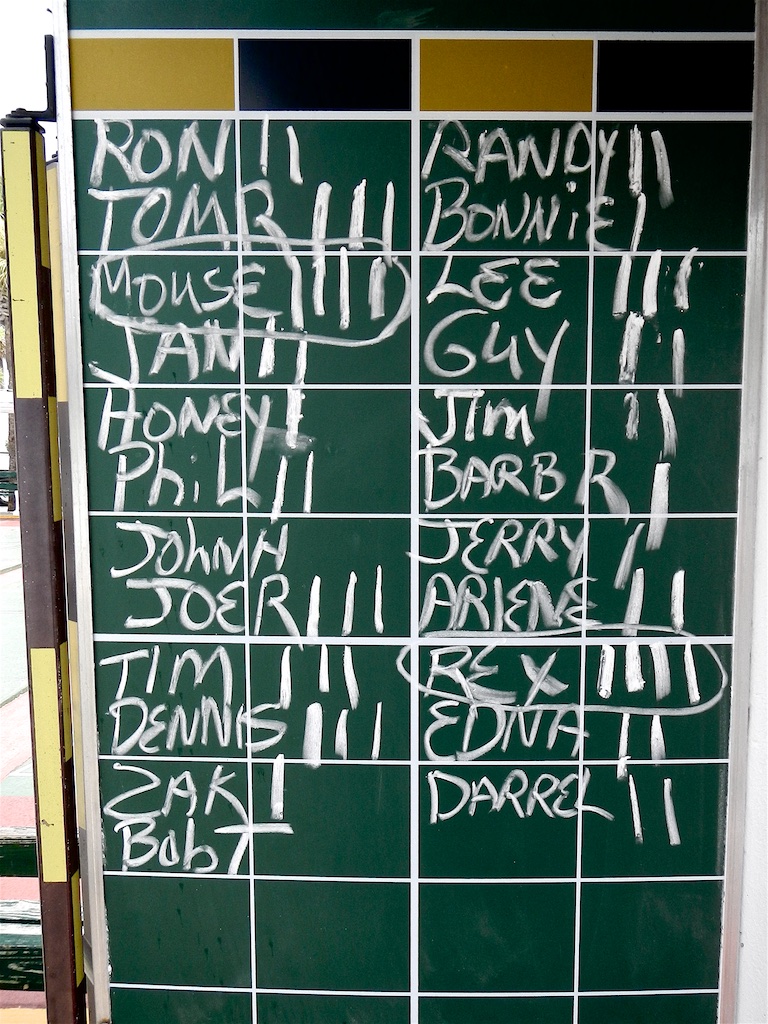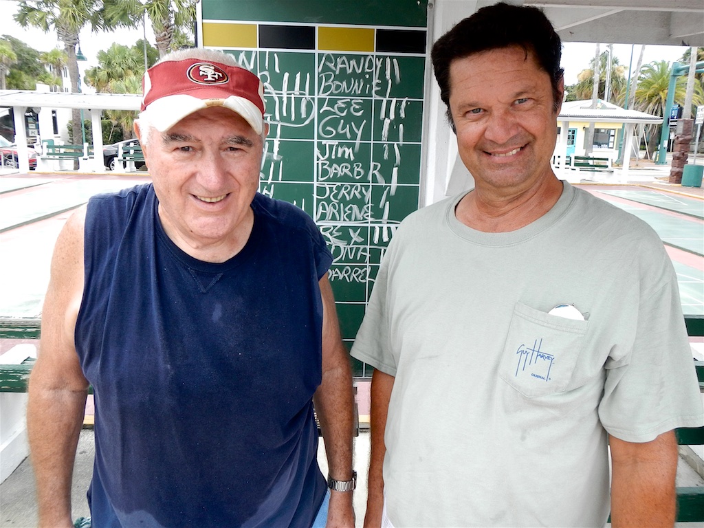 Today’s Thursday Morning Four-Play matches, overseen by Ron Raymond, attracted Twenty-Three (23) steadfast shufflers who showed up for a little shuffling competition. This week “Mouse” Wolven (with his resurrected cue) and Rex Galusha (without his new florescent shoes) won all four of their matches. …way to go! We are looking forward on seeing you all shuffling again on Flagler Avenue next week. Hasta la vista!