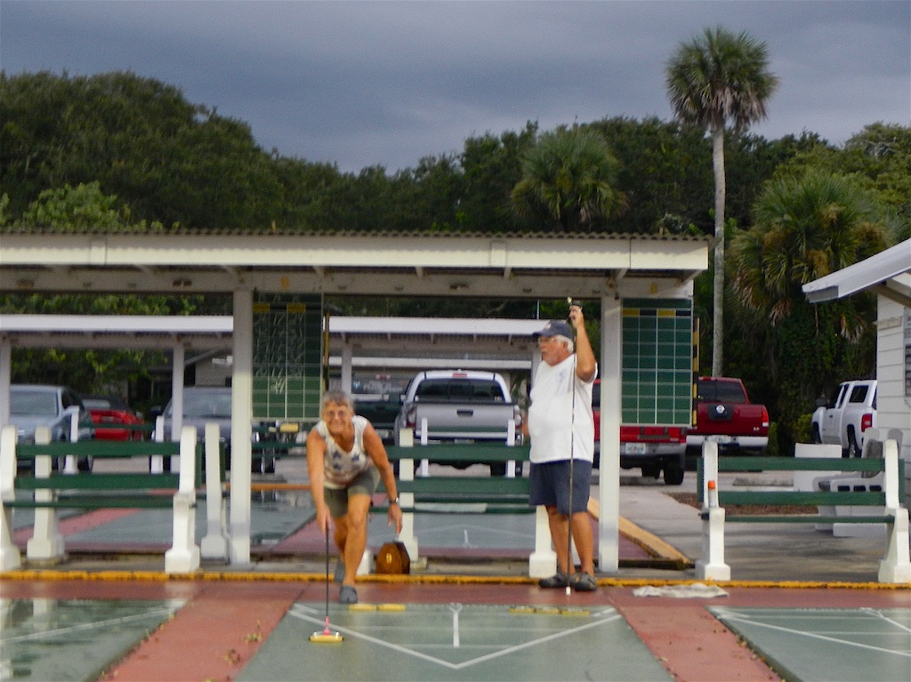 And yet another RAINOUT – It looked ominous when we arrived after a heavy rain but three (3) stalwart shufflers still showed up, squeegeed, cleaned and beaded a court. We managed to play one and a half friendly matches of round robin when lightning made us a little anxious. The black clouds rolled in and the rain unloaded on us. The rain was relentless, so we packed it in and went home……until next time! Adios!