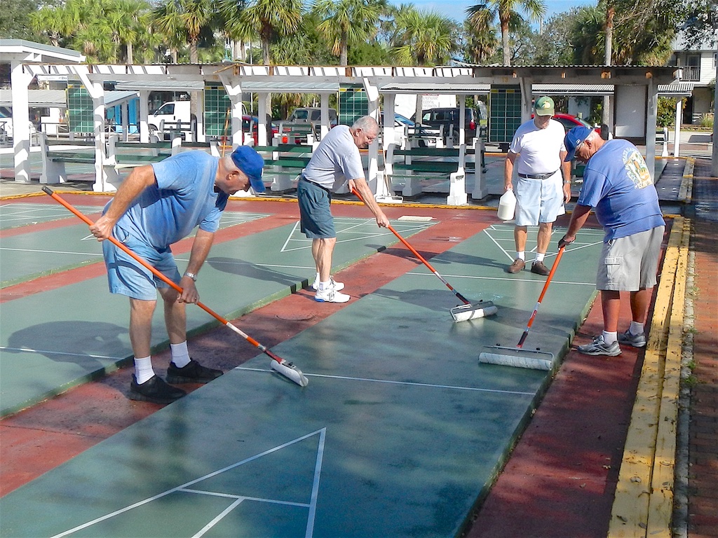 Between 8:00 am and 9:30 am nineteen (19) eager volunteers showed up this Monday to sweep, wash, wax, and clean up the shuffleboard courts. We finished up at approximately 11am. Our volunteers totally cleaned and washed the cue house so that Tim Pergrem could paint the floor after he finishes painting the cue room. The scoreboards were all washed along with the sponges/erasers. All the discs had already been painted. Allen and Debbie worked on the Historical Bulletin Board in the club house. We would like to thank all of today’s volunteers: Allen and Joan Best, Gerry Bousquet, Dennis Buelk, Mona Carkner, Debbie Evans, Darrel Hartman, Dave Helverson, Arlene and Jerry Jabaut, Wayne Lockwood, Carolyn Menosky, Don Nephew, Tim Pergrem, Bonnie and Randy Radke, Ron Raymond, Joe Rossitto and Mouse Wolven. Allen Best understands that some of our members may have had a conflict of interest that may have prevented them from participating in today’s Clean-Up. If your name was not included in today’s clean up list, Allen looks forward to your volunteering for the next clean up and/or working the next local shuffleboard tournament. PEASE DO NOT ENTER THE CUE HOUSE OR USE THE SHUFFLEBOARD COURTS UNTIL TUESDAY NIGHTS REGULAR SHUFFLEBOARD PLAY. AGAIN, THANKS TO ALL!