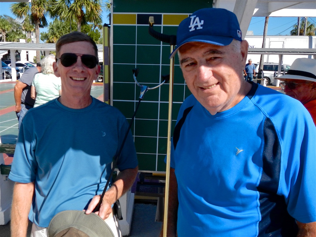 The CMS Shuffleboard Club in New Smyrna Beach was the host for the Northern District Any Doubles Tournament on Thursday and Friday, October 20/21. Twenty-nine (29) avid teams showed up to meet the challenge and place for cash prizes and bragging rights. Rich Kordeleski and John Fortini put canvases up to cover hurricane induced missing roofs on the courts. Candy Kordeleski, Barb Fortini and Arlene Jabaut came early to set up the coffee and donuts. Joan Best took care of the 50/50 distribution.