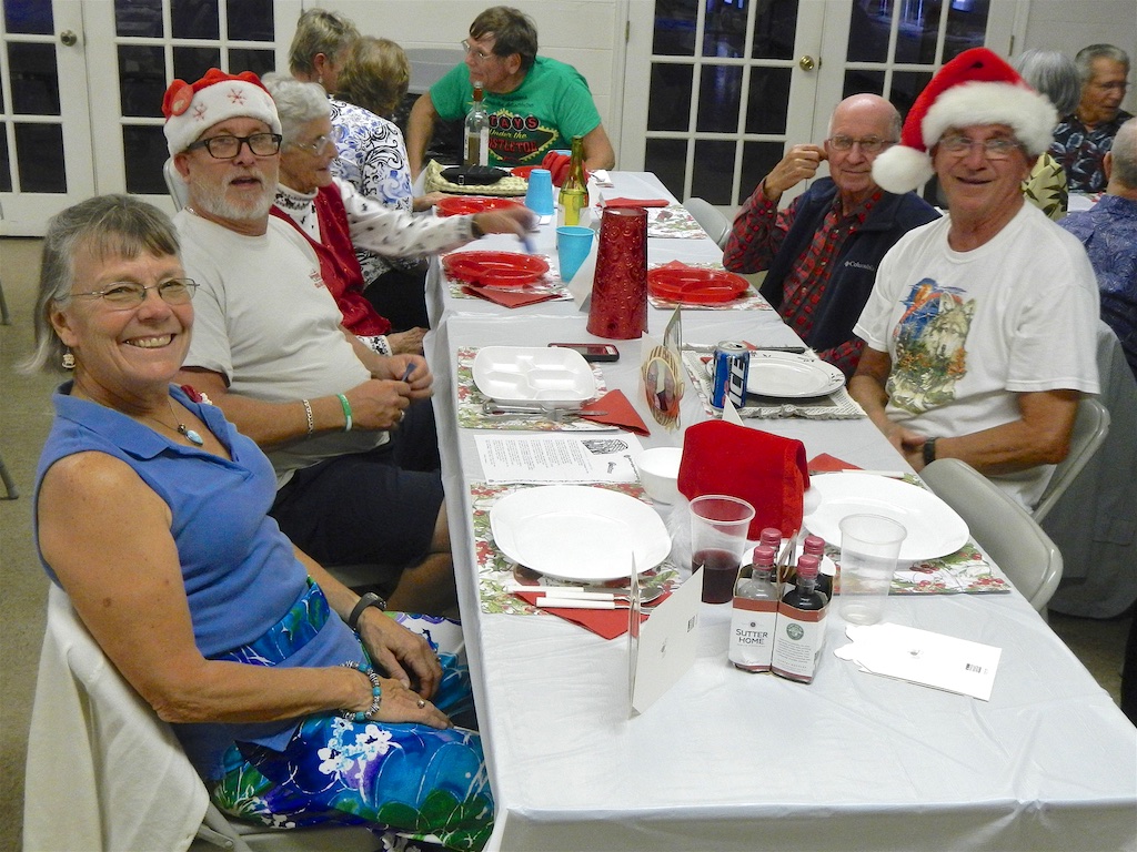 Last night we held our Christmas Pot Luck Dinner. Johnnie, Betty and Felix came early and did a wonderful job of setting up the tables and decorating them with Poinsettias, Christmas hats and festive place settings. Johnnie also provided personal pictures of club members in Christmassy card frames for everyone to enjoy. Approximately 40 club members began arriving at 5:00 pm. Mary McConnell was collecting the 50/50 at the door.