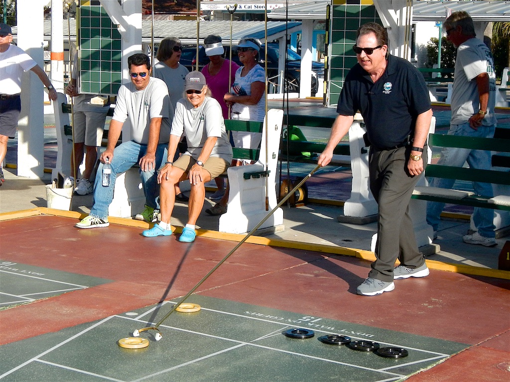 Everyone then proceeded to the courts where the Mayor and Nancy had a short match for points…..Nancy won with a score of 15 to the Mayor’s 7. Then Dennis explained the scoring and rules for match play. We played five matches with twelve frames each. Winning shufflers wrote down their scores after each match. Dennis added up the winner’s scores to determine those that placed for payout winnings.