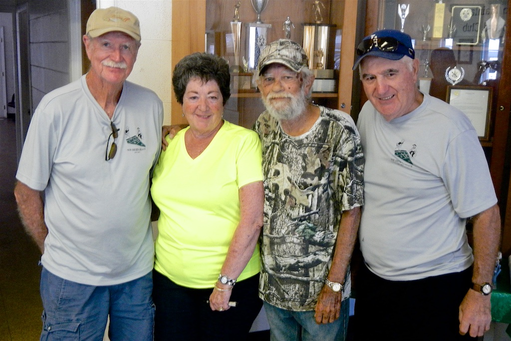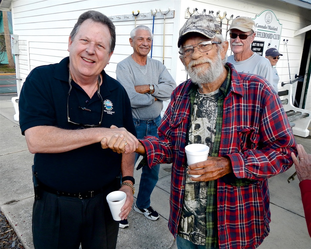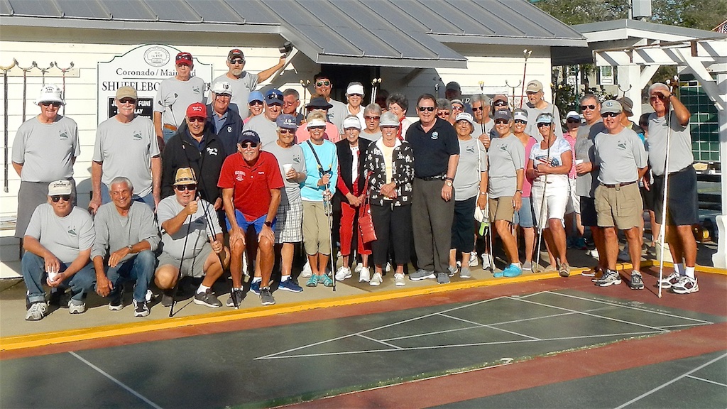 Dennis Buelk organized and collected the tournament’s entry fees. Eleven (11) Pros and Thirty-One (31) Amateur shufflers signed up to play. The Mayor, Jim Hathaway accompanied by Kimla Shelton and Nancy Maddox from Parks and Leisure arrived about 8:30am for a Meet and Greet with coffee and donuts. Allen Best presented the Mayor with a Shadow Box containing one of our 80th Anniversary Celebration Shirts. Allen also showed a picture of Bill and Penny Boyes and explained for those who knew them that they had gone home for the birth of their grandchild when Penny’s health took a turn for the worse. Penny and Bill are in our thoughts and prayers. We said a silent prayer for those members in distress. We then Pledged our Allegiance to our Flag.