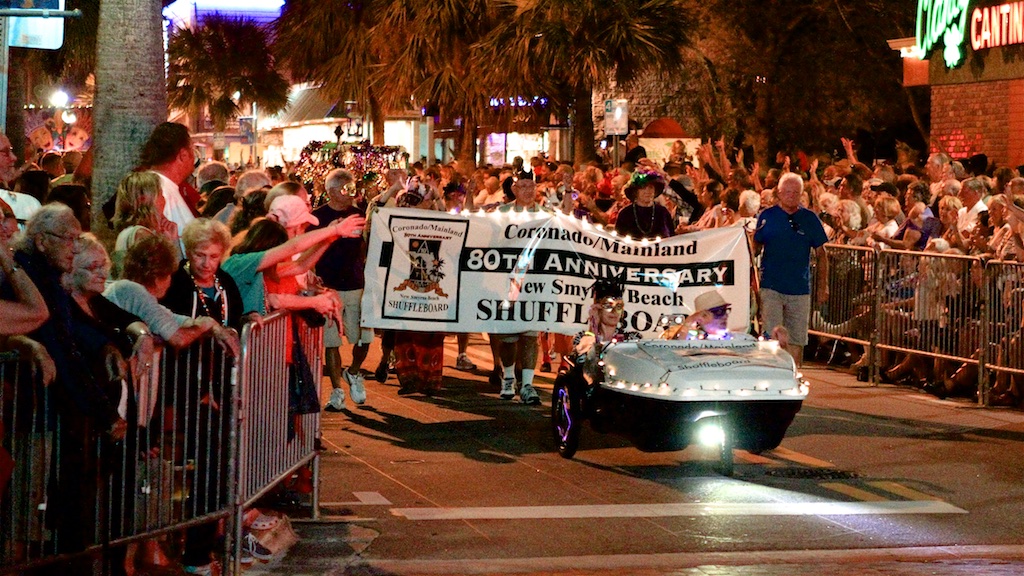 At 7:00 pm the officials kicked-off the parade and we marched up S. Atlantic to turn onto Flagler Ave. There were so many people calling out to friends, imbibing on spirits/beer and begging for beads. Such a jovial time. It seemed that many more people attended this parade as compared to last year’s parade. The noise and excitement was exhilarating. As we reached Pine Street, Tom and Susan’s peddle car antics excited the crowd into waves of laughter.