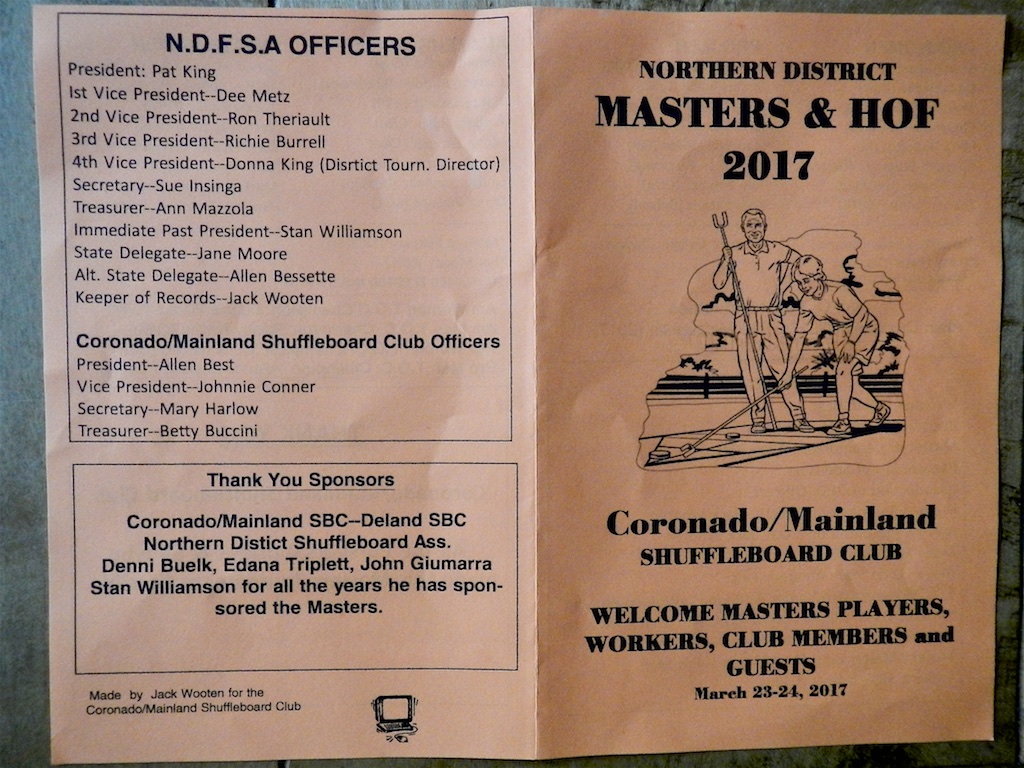 The Masters Tournament took place at the CMS Shuffleboard Courts on March 23rd and 24th. Thirty-Two (32) avid players turned up to meet the challenge. Rich Kordeleski and his crew put the courts in excellent shape. Marguerite and her kitchen crew had coffee and donuts on hand. Every thing was properly prepared for this special event.