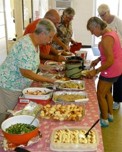 Twenty-Seven (27) lighthearted members and guests of the CM Shuffleboard Club got together to enjoy our monthly Pot Luck Dinner, which included some of our Mahjong Social Members. After Joan Best collected for the 50/50 drawing during the initial social hour, Allen selected a new member to draw the winning ticket. Honey Donnelly, one of our newer members, won the pot. Joan Best then lead us in a prayer before we lined up to enjoy the bountiful, tasty food everyone had brought to share. After an enjoyable meal, we cleaned up, put the tables and chairs away and then some of the members retired to the club room for an enjoyable game of Bunco. A great time, on a beautiful night was enjoyed by all. See y’all next time.