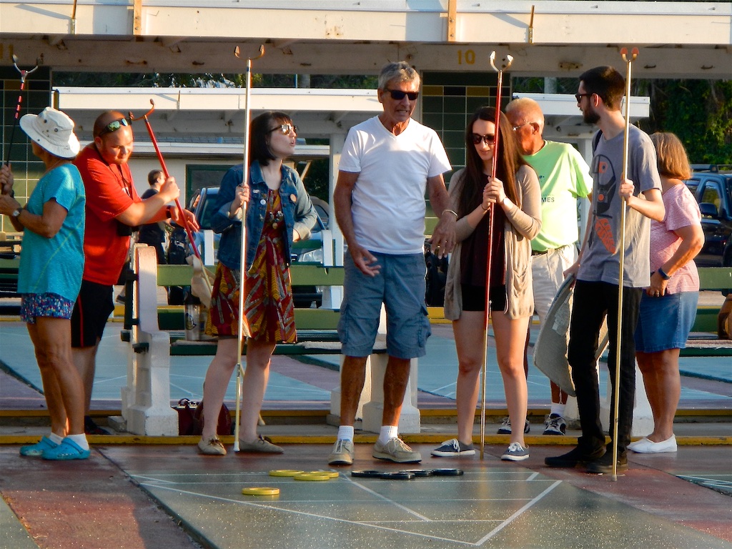 Wednesday night, May 10, 2017, the CMShuffleboard Club hosted some of the graduates from the University of Central Florida School of Photography. With some help from volunteers, Dennis guided eight (8) students and two teachers, Justin Nolan and Laine Wyatt, through the rules of shuffleboard. Then we set up two courts before the fun began. For the next couple of hours there was laughter as the students discovered shuffleboard was not as easy as first expected. They challenged each other for the fun of it. Thank you to Dennis and the volunteers for making this a fun evening of shuffleboard. We would like to thank the students for their donation to our club for their use of the courts and our time instructing them. Hopefully some of them will return to play again and/or join the club.
