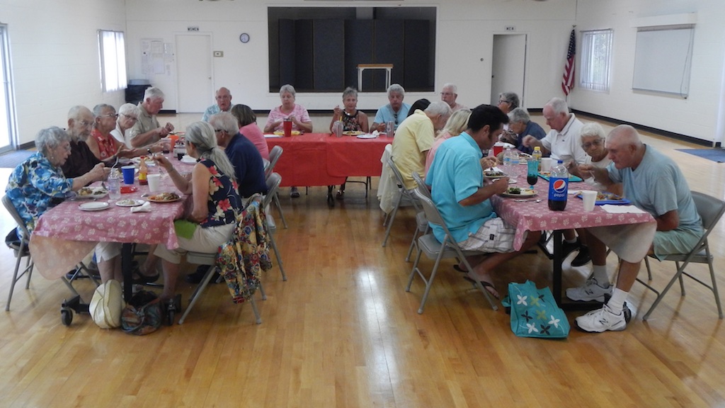 The May Friday Night Pot Luck Dinner was attended by Twenty-Two (22) hungry shufflers. We had three tables set up in the “Big Room” because it was air-conditioned on this sultry Friday evening. Joan Best pitched in for kitchen duty because Marguerite had gone back North. The food was, as usual, marvelous.