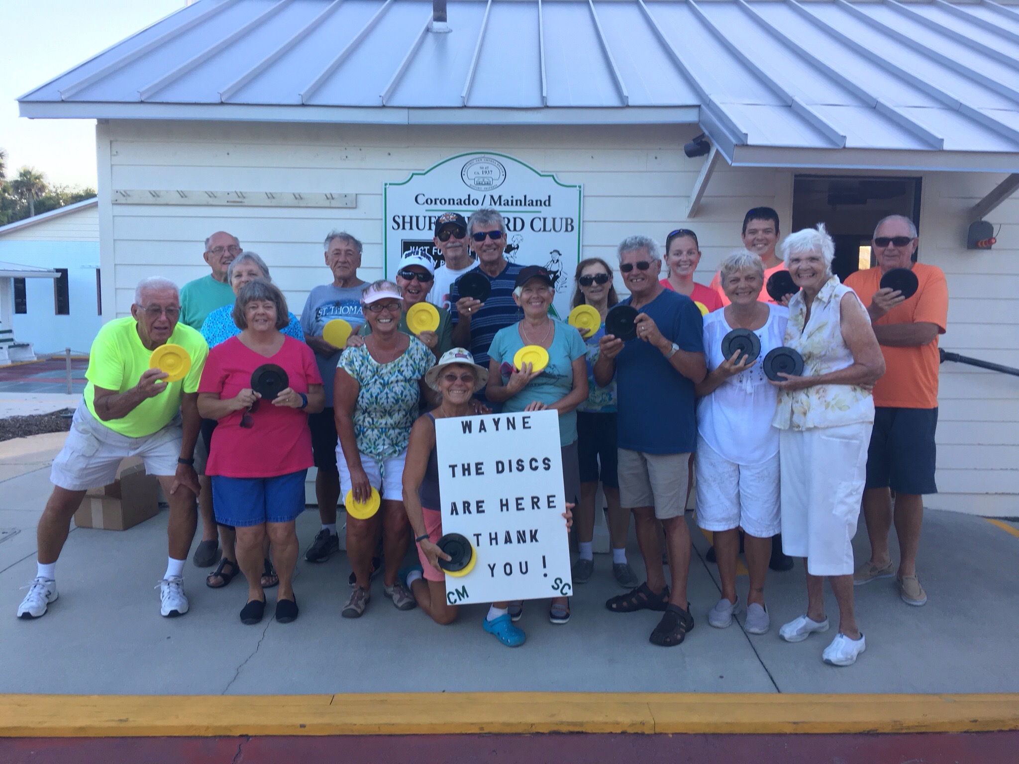 Al Best, on behalf of the CMS Club, would like to thank Wayne Lockwood for donating our brand new discs. They have finally arrived! Now we need to get them painted with the identifying dots and wait till we can clean and wax our courts before we use them. We would not want to ruin the discs first thing by using them on dirty courts. We will also need to remember not to slide them on the concrete red edging or out of bounds area. We will need to pick them up and replace them back on the courts during play instead of sliding them on. Once Allen gets back we will begin the job of getting everything prepared. Once again thanks to Wayne and thank you all for your patience. For any further questions and/or concerns, please contact Al Best.
