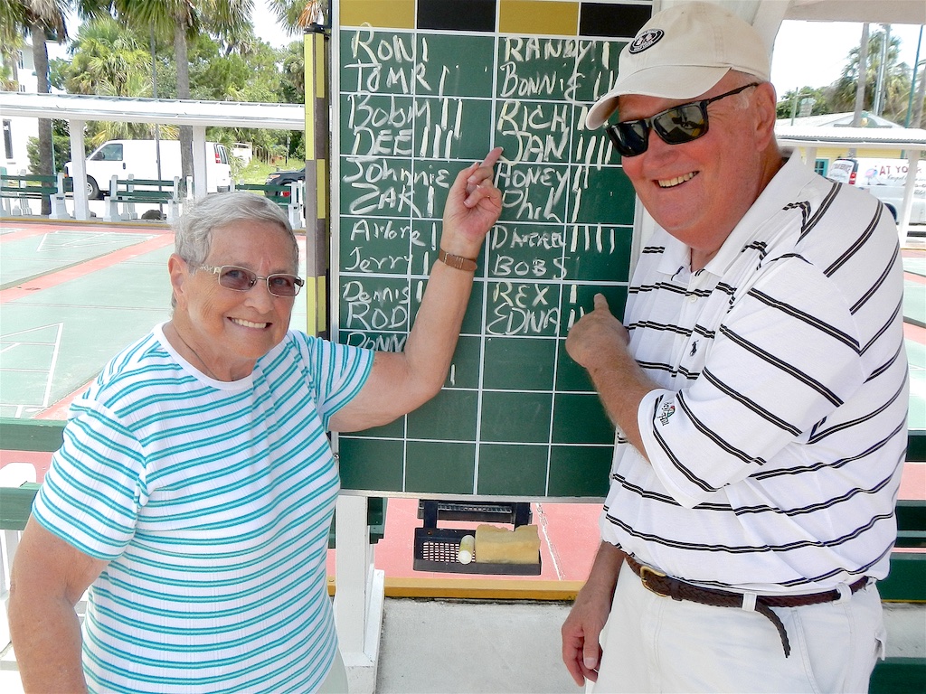 This morning dawned sunny, hot and muggy but we still had twenty-two (22) ardent shufflers show up. Ron Raymond and his crew cleaned and prepared the courts before play began. Ron had us play two courts with round-robins. Congratulations to Jan Dally and Darrel Harman for winning all four of their matches. See you next week for another invigorating game.