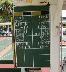 Ron Raymond and his crew showed up as usual to prepare the courts for play. Dennis sent me these results to place on the WEB. Twenty (20) shufflers showed up for the morning games and only three (3) players won all four of their matches. Congratulations are due to Edna Triplett, Bob Tager and Rod (Lewis?) for games well played. See you all next week for more fun and games. Ciao!