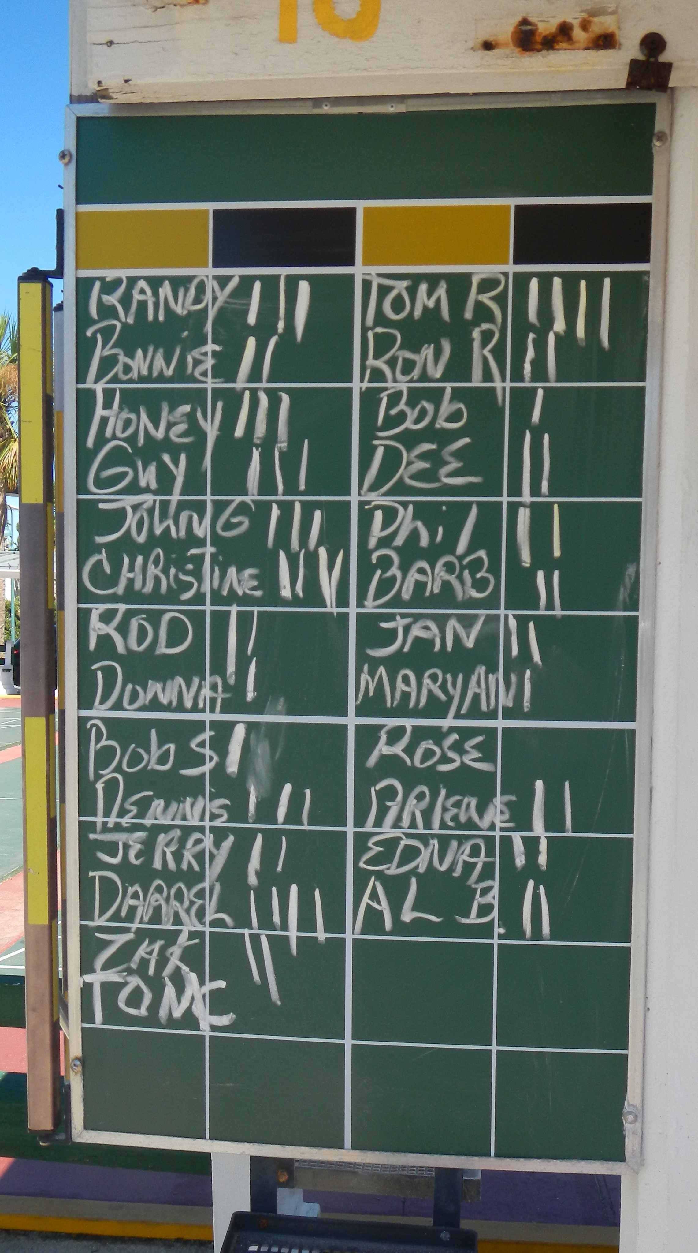 Today was the Final Day of the season for our Thursday Morning Four-Play. The expected crew showed up to prepare the courts for match play. Thirty-Two (32) ardent players showed up to challenge each other on the shuffleboard courts. We only had the following three shufflers who won all four of their matches, Tom Rimmer, Christine Giumarra (from Deland) and Darrel Harman. Congratulations!
