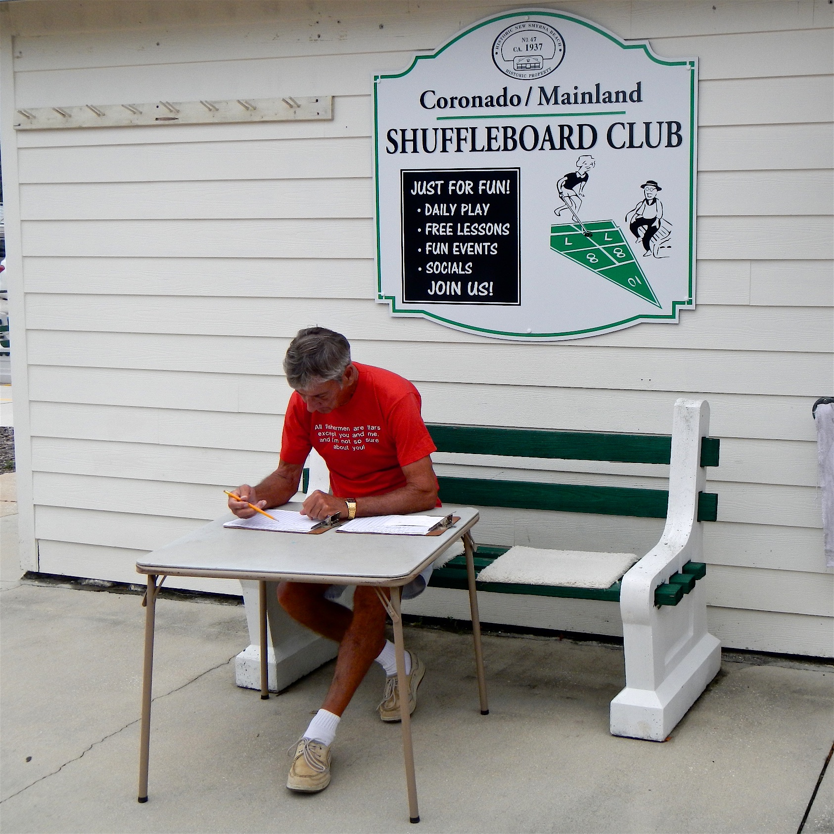 The usual volunteers showed up to clear the courts from the rain last night and prepare the courts for morning play. Dennis Buelk collected the registration fees and explained the rules of the game. Eight (8) Pros/State Ams and Eight (8) Amateurs showed up for the challenge. We each played five matches with 12 frames apiece. Dennis then tallied the winning scores at the end of play.