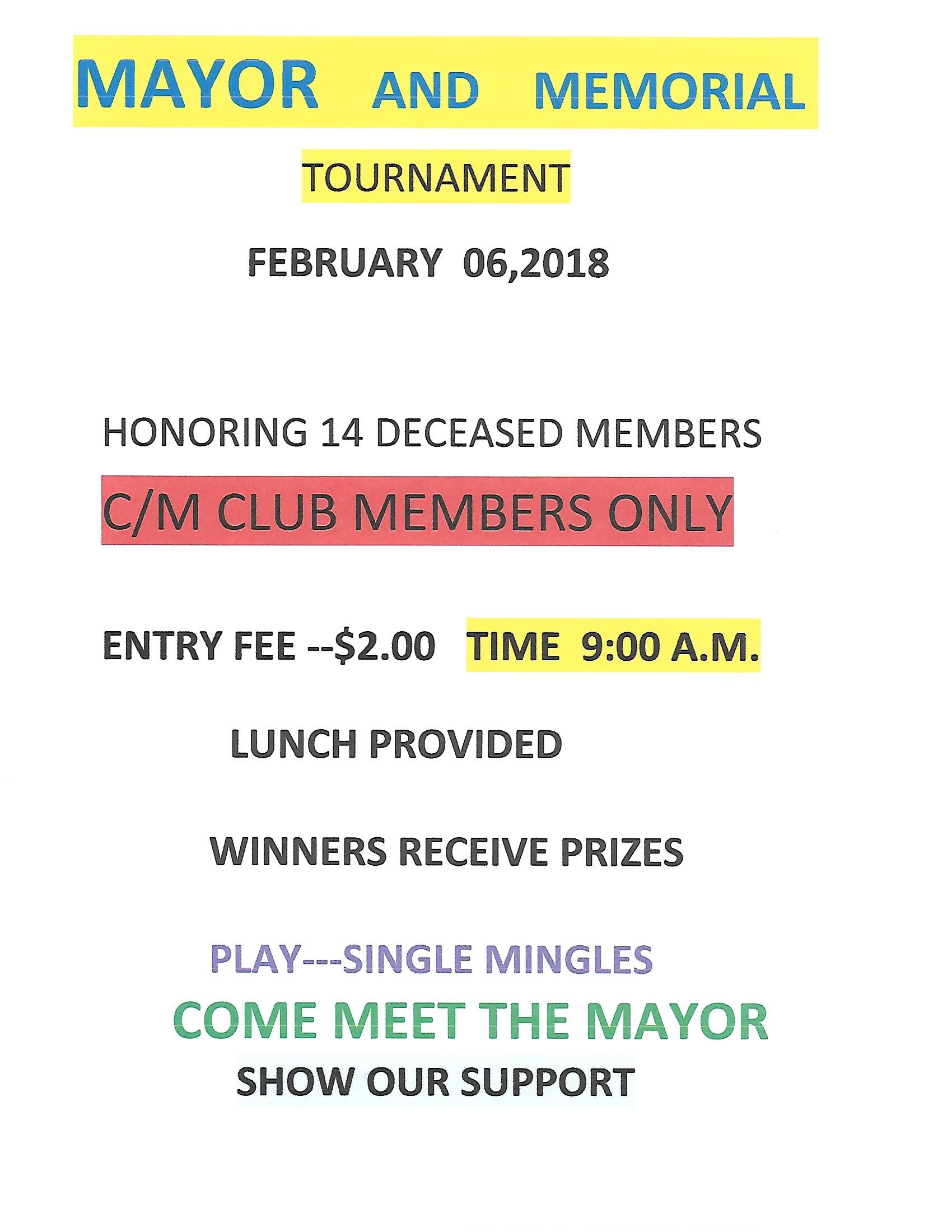 On February 6th we will be holding a combined tournament. The CMS Club has combined the Mayor’s Memorial with a CMS Memorial Tournament honoring the  Sixteen (16) CMS Club members that have passed over the last three years. This is a members only Tournament. The Entry fee will be $2.00  (includes lunch) beginning at 9:00 am (please be there no later than 8:30 am for registration). Lunch will be provided for participants and volunteers.  It will run as a Singles Mingles format followed by prizes for the tournament winners.  If you do not plan on volunteering or participating, please come by in order to show support and cheer on  the members who are.  COME MEET THE MAYOR!   See you there! Ciao!