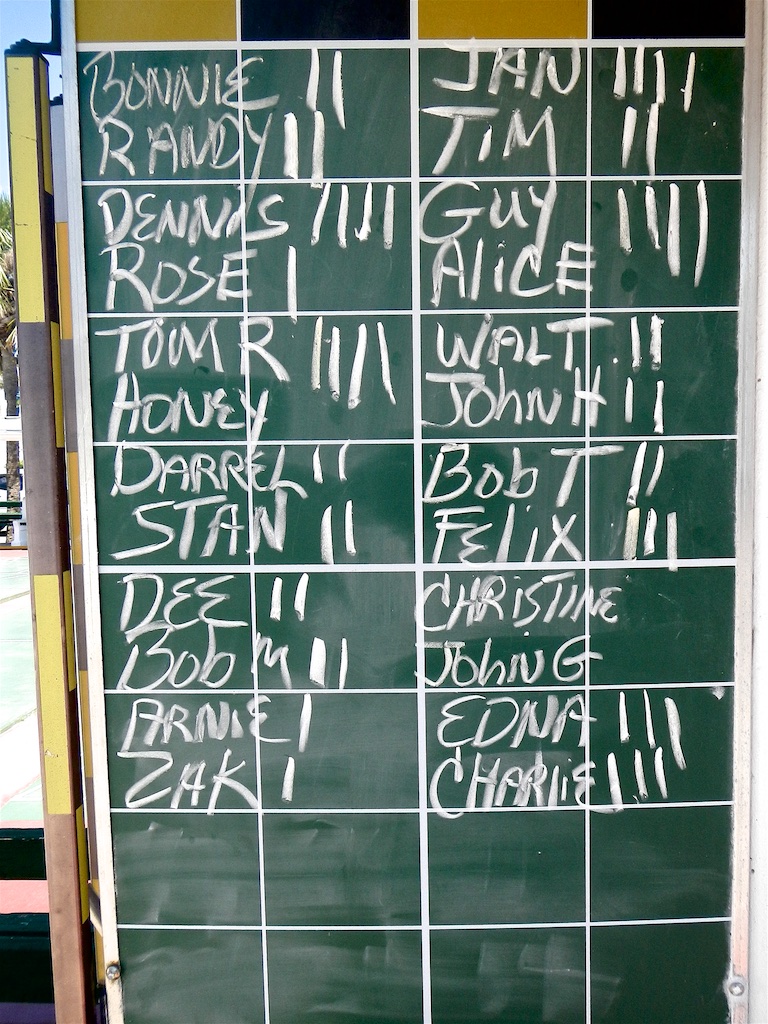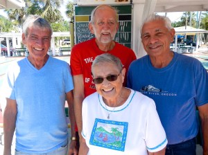 The usual clean up team showed up to prep the courts for Thursday Morning Four-Play. Twenty-four (24) shufflers were registered for this friendly challenge. Dennis Buelk explained the rules and handed out the court selection chips. We each played four matches in which winners recorded their wins. All shufflers redrew a partner and court after each match. When all the games were finished, we cleaned the courts and cheered the four match winners. Congratulations to Guy Godman, Tom Rimmer, Dennis Buelk and Jan Dally for winning all four of their matches. Hope to see you all back here again next week for more fun and games. Ciao!