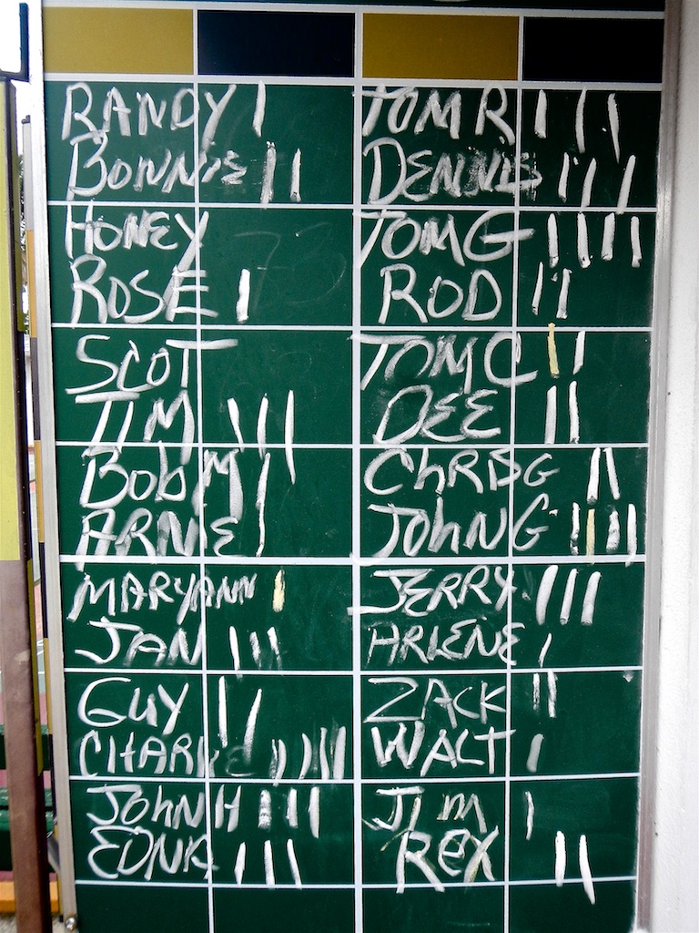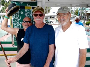 The usual clean up crew showed up to prep the courts for Thursday Morning Four-Play. Twenty-Eight (28) shufflers were registered for this friendly competition. Dennis Buelk explained the rules and handed out the court selection chips. We each played four matches in which winners recorded their wins. All shufflers redrew a partner and court after each match. When all the matches were finished, we cleaned the courts and disks. Congratulations go out to the FOUR (4) Match Winners Tom Grubb, Charlie Jones and John Giumarra. Hope to see you all back here again next week for more fun and games. Ciao!