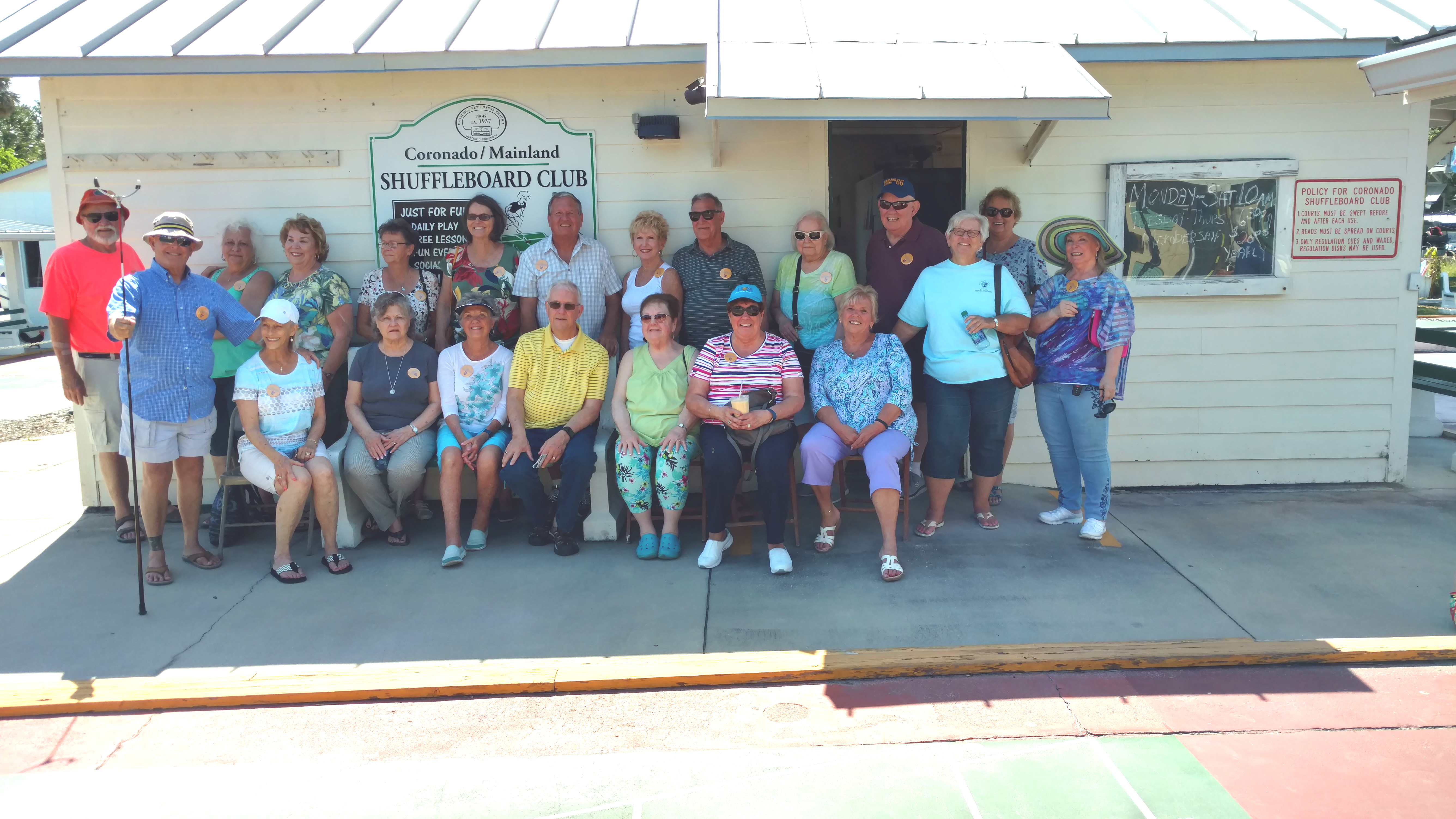 We had Ten (10) Volunteers show up to help set up, teach and clean up the Coronado/Mainland Shuffleboard Courts for play by the Daytona Mainland High School Class of 1966 Reunion attendees. A big Thank you to Candy Kordeleski, Tom Carbonell, Tom Grubb, Dennis Buelk, John and Barb Fortini, Allen and Joan Best, Jerry and Arlene Jabaut. We used 5 courts and the Class of 66 had a ball…John, Arlene and Tom C all took some pictures (seen below) to help remember and celebrate the fun.