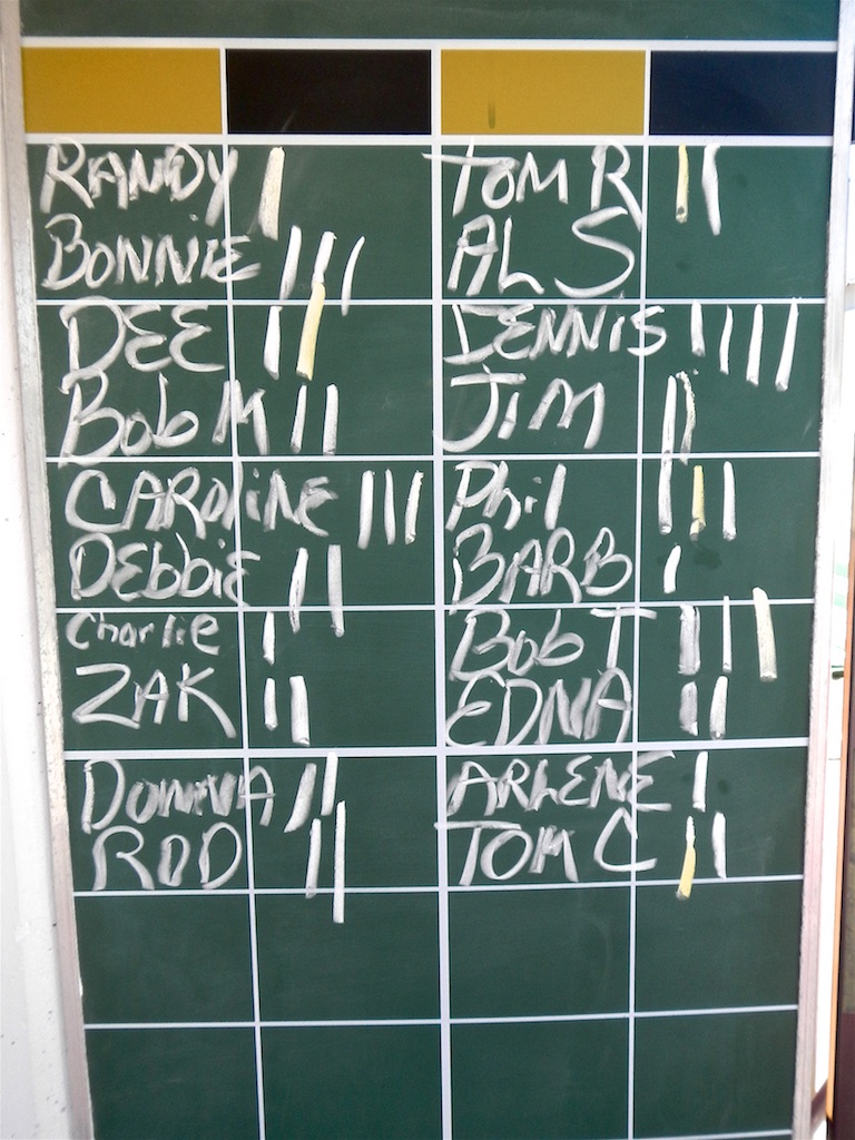Early this morning the usual clean up crew arrived to get the available courts in order for the TMFP matches. Tim Pergrem and Tom Grubb were already there prepping to finish-up painting. We played on courts 13 thru 16 and court 18. Twenty (20) enthusiastic shufflers showed up to meet the challenge. We each played our four matches, recording the winners after each match. When we were finished we cleaned up the courts and helped to prepare them for painting. Congratulations to Dennis Buelk, the only player to win all four of his matches. Hope to see you back again next week. Ciao!