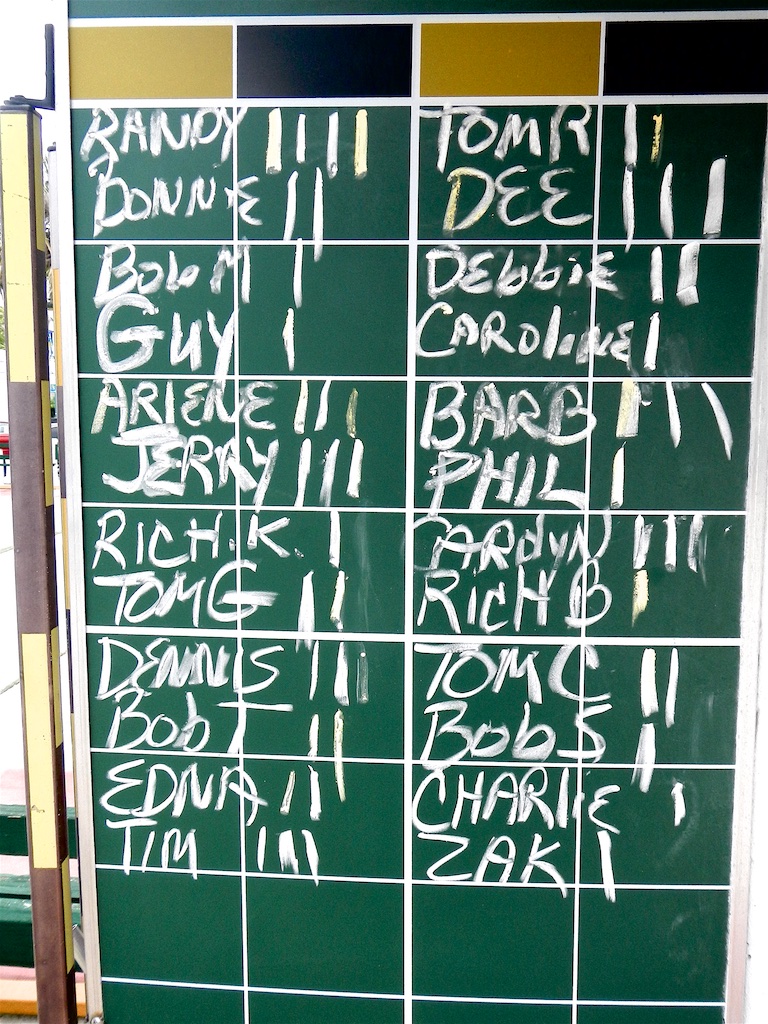The crew arrived early on this rain free morning to clean off all the rain puddles in order to make the courts ready for play. Twenty-Four (24) shufflers enthusiastically showed up in part as a relief from this past week’s incessant rain. We each were able to play all four of our matches this morning under sunny skies. After changing partners and courts between matches, we recorded our wins. Congratulations go out to Randy Radke for being the only shuffler to win all four of his matches. See you all again next week to meet for more fun and games. Ciao!