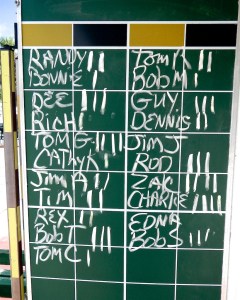 This morning the usual clean up crew arrived to clear and prepare the courts for the Thursday Morning Four-Play Challenge. Twenty-One (21) enthusiastic players showed up to meet this challenge. We each picked our courts and partners for four matches. The winning team from each match recorded their win. We congratulate Tom Grubb, Charlie Jones and Zak Wonson for winning all four of their matches. We’ll see you back here next week for more fun and games. Ciao!