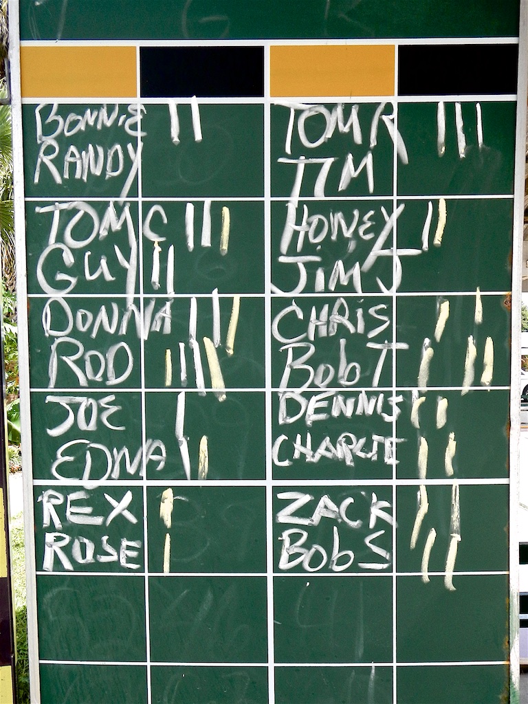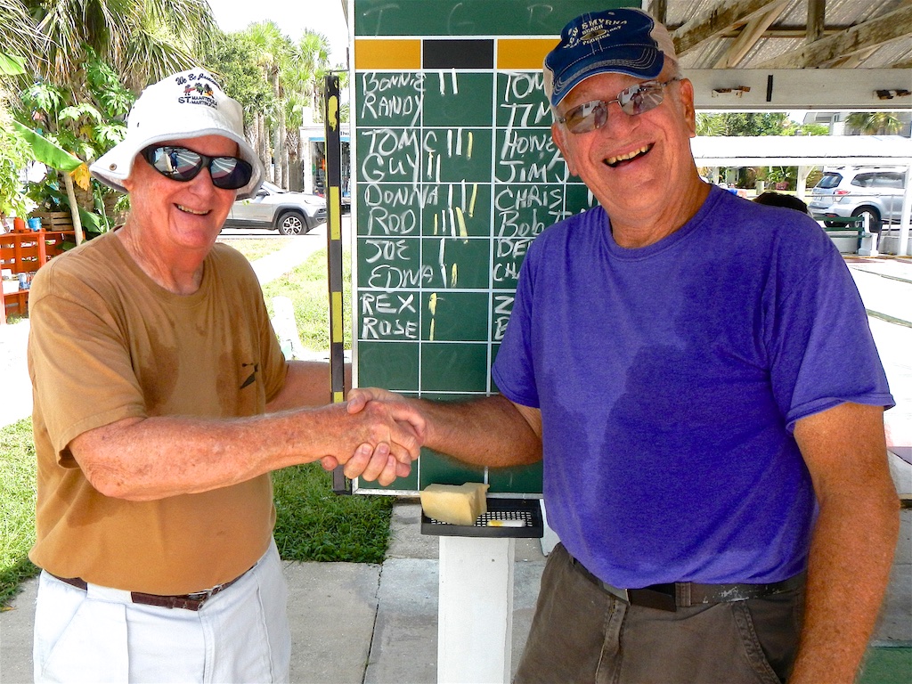 The usual morning clean up crew arrived early to prep the courts for our Thursday Morning Four-Play Challenge. We played on the lower courts because Nidy was still working on the upper courts. Twenty (20) enthusiastic players came for the TMFP Challenge. Shufflers each played four matches. Congratulations to Bob Tager and Rod Lewis for winning all four of their matches. Next week we should be playing on our newly refinished courts. Hope to see you then. Ciao!