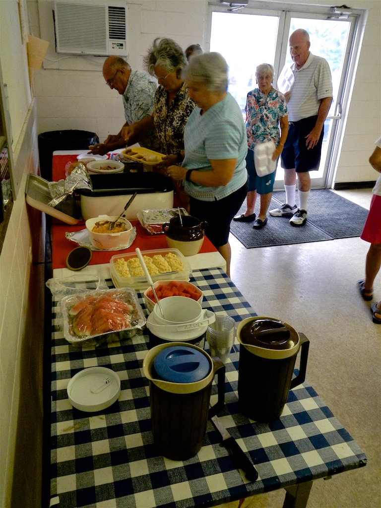Friday night we held our July Pot Luck Dinner. Thirteen (13) members showed up. Rich, Candy, Connie and Gerry gave us a pleasant surprise by their attendance. It was a small party so we changed the positioning of the tables to face each other. Pres. Tom Carbonell reported on the expected progress of the Nidy court renovations. He explained that we needed to seal the completed courts with wax before playing on them.