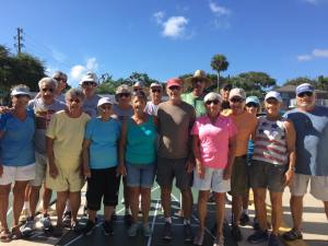 John Fortini returned to the courts following some alteration (band-aid) to his mug. To make him feel more comfortable, we all (instigated by Al Best) donned band-aids on our noses. We all had our backs to him when he arrived but turned around at once to cheer him up and welcome him back. Debbie Evans took a picture of all of us. We all had a good laugh.