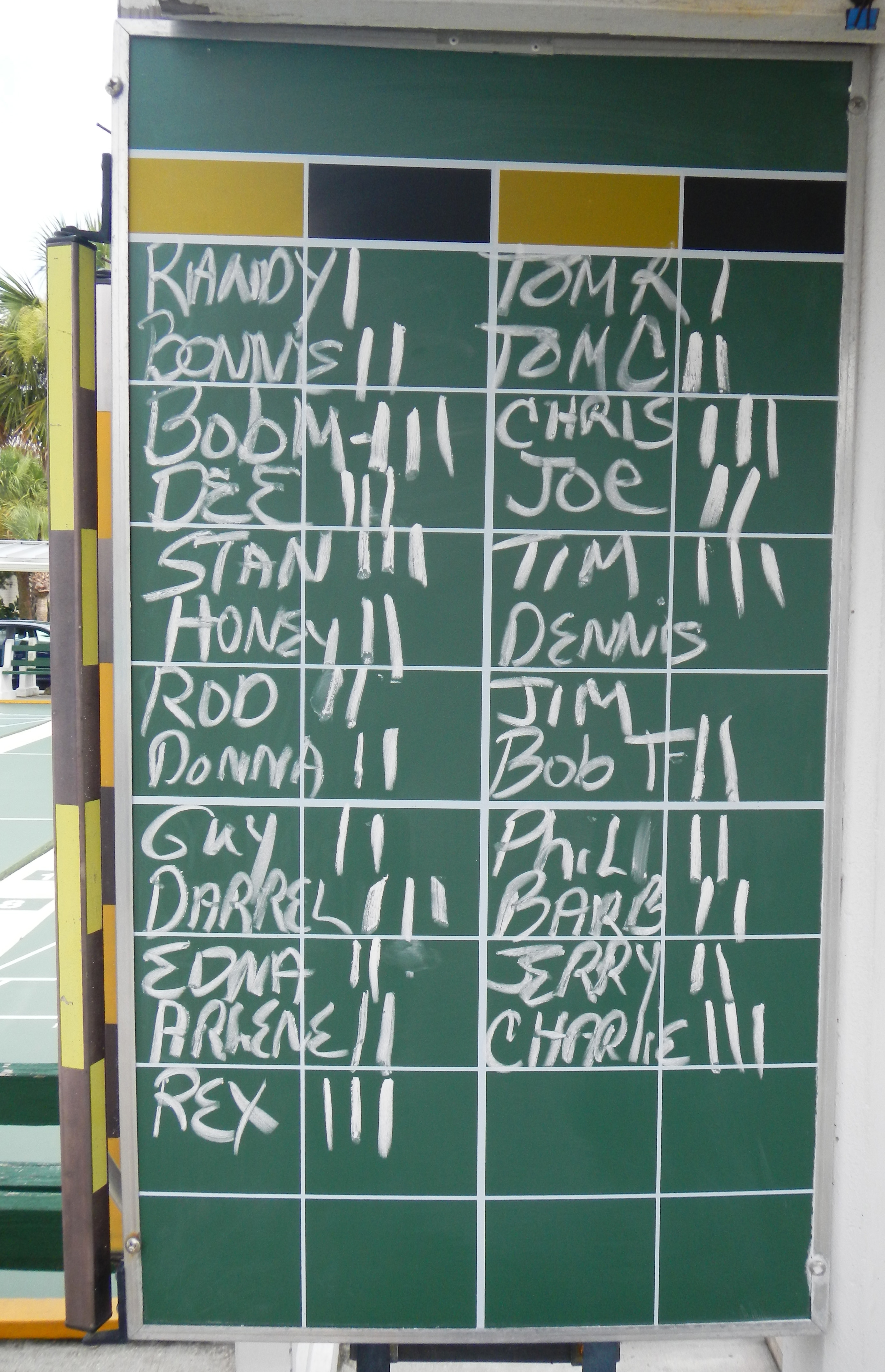 This morning the usual crew plus Tom Carbonell showed up to clean the courts and get them ready to play our Thursday Morning Four-Play Challenge. Twenty-Five (25) enthusiastic shufflers came ready for the challenge. We each played four matches. At the end of play No One was able to win all four of their games. Hope to see you next week to meet the challenge. Ciao!