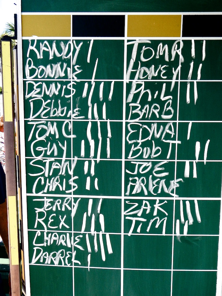 The usual clean up crew arrived to clean and prepare the courts for the Thursday Morning Four-Play Challenge. Twenty-Two (22) ardent shufflers came for the challenge. We each drew for partners/courts, played four matches and recorded our wins at the end of play. We can congratulate Dennis Buelk, Charlie Jones and Guy Godman for winning all four of their matches. Come visit with us next month for some more healthy competition. Ciao!