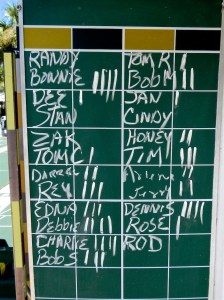 This morning the usual clean-up crew showed up to prepare the courts for our Thursday Morning Four-Play Challenge. We had Twenty-Three (23) enthusiastic players show up for the TMF-P Challenge. One court was a “Round Robin”. Each shuffler played four matches. We Congratulate Charlie Jones, Debbie Evans, Bonnie Radke and Dennis Buelk for winning all four (4) of their matches. Next week is our last week to play this TMF-P Challenge. Hoping to see you there. Ciao!