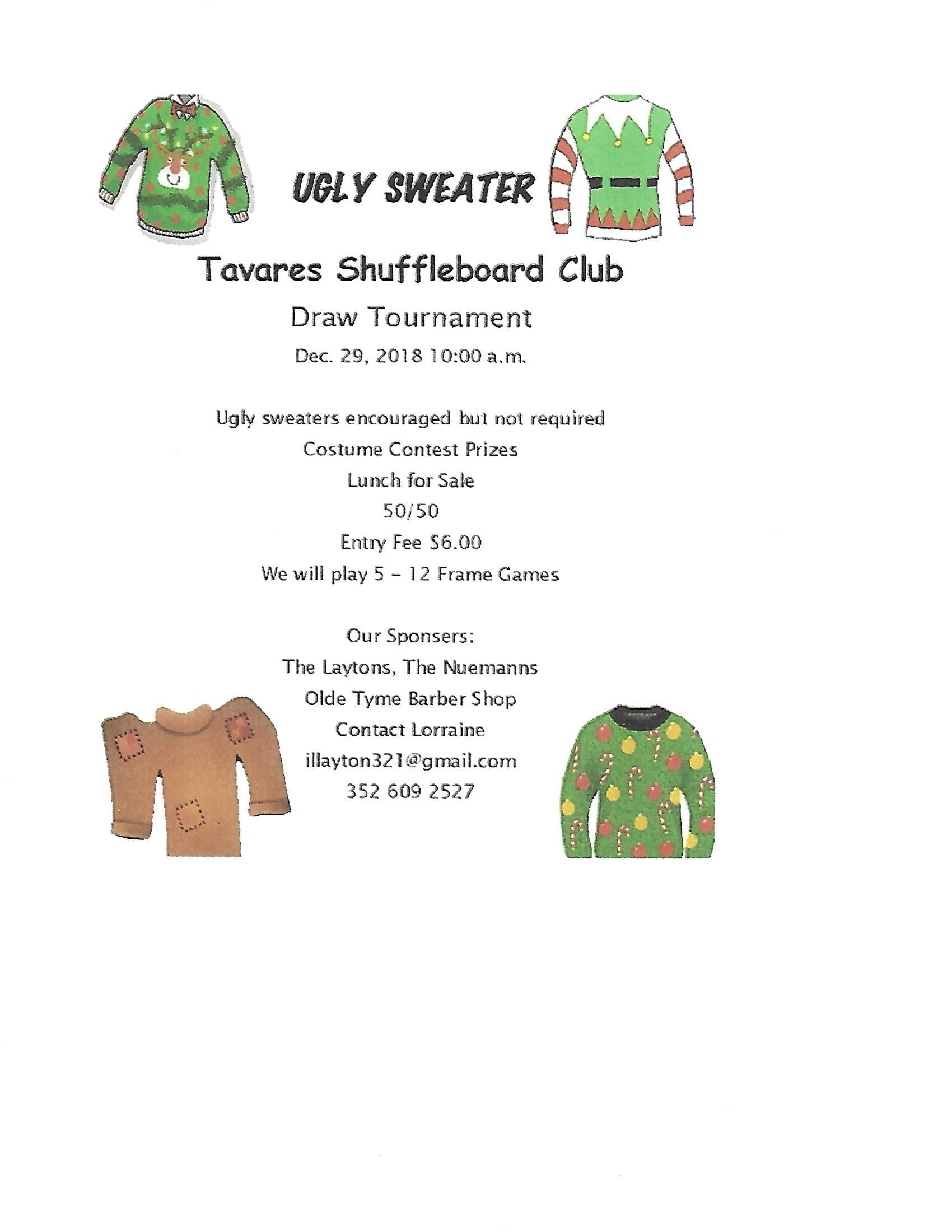 Hi! Shufflers: Attached is the Poster for the Tavares Tournament. This tournament is open to all shufflers, who are a member of a Florida Club. Please pass this info. on to anyone you think may be interested in playing. To get started on time, we ask that you arrive by 9:45 and enjoy a coffee and/or donuts with fellow shufflers. There are no points for this tournament, it is only for fun and for one day. Every player will play 5 games and there will be no waiting to play, unless, we exceed the number of players that fill our courts, 20 of them. We do have sponsors for the tournament , as well as the registration money, that will go into prize money. See you on the courts. SEE POSTER BELOW!
