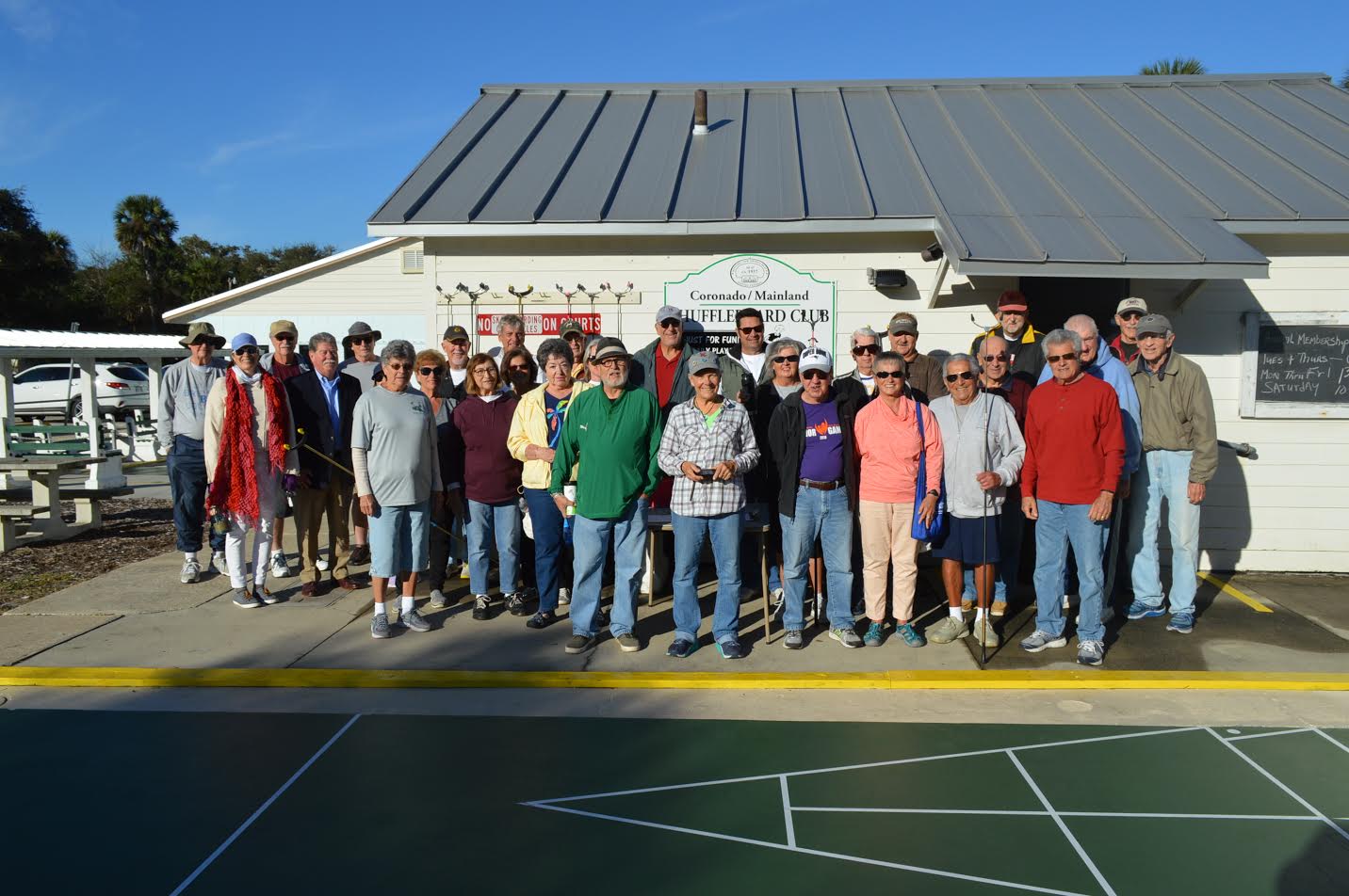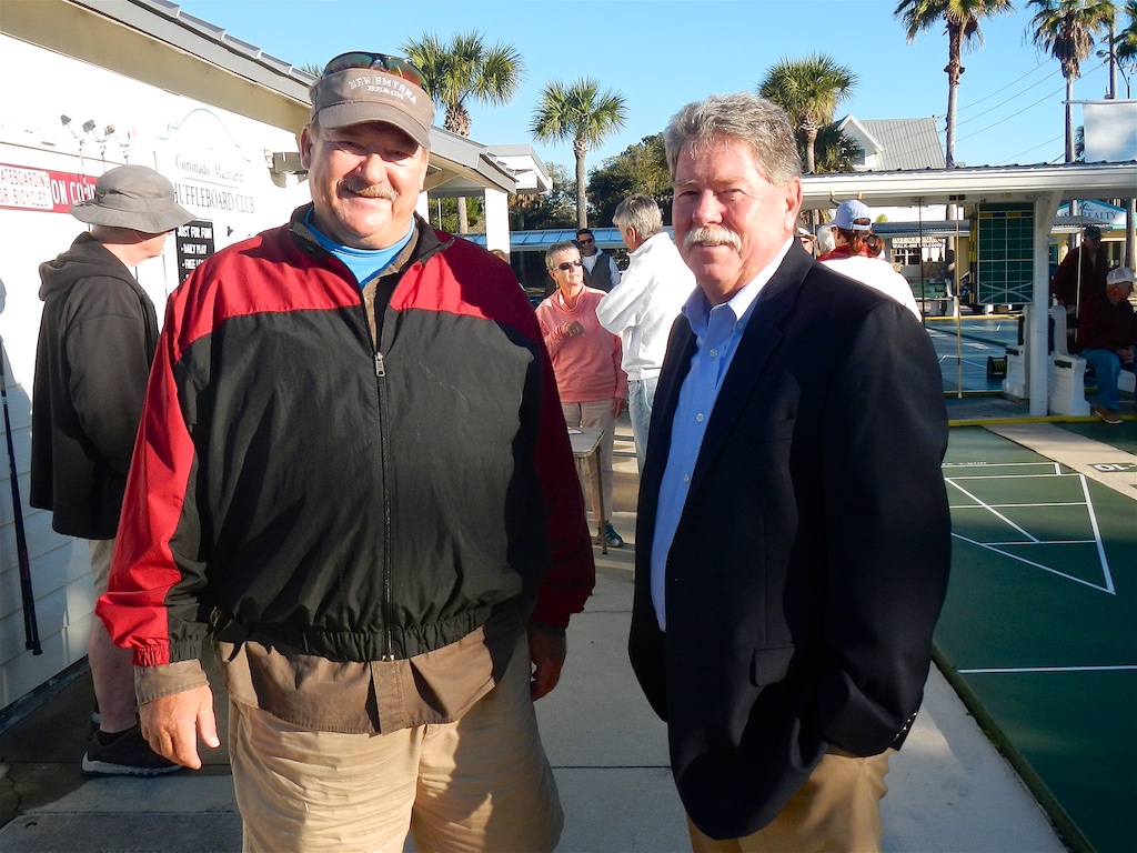 This beautiful morning was just ideal for our Mayor’s Tournament. The usual clean up crew arrived early to set up our good-looking refurbished courts. Marguerite Fortier and Mary McConnell also arrived early to set up the kitchen. We’d like to thank Kimla Shelton from the City of NSB Parks and Recreation for supplying the donuts which we enjoyed with our coffee. Tom Carbonell called us to order by welcoming our Vice Mayor Randy Hartmann and Phillip Veski, the city Public Information Officer. We said a silent prayer for those who could not be with us and then we pledged allegiance to our flag.