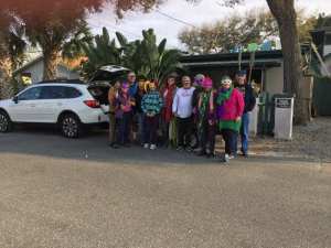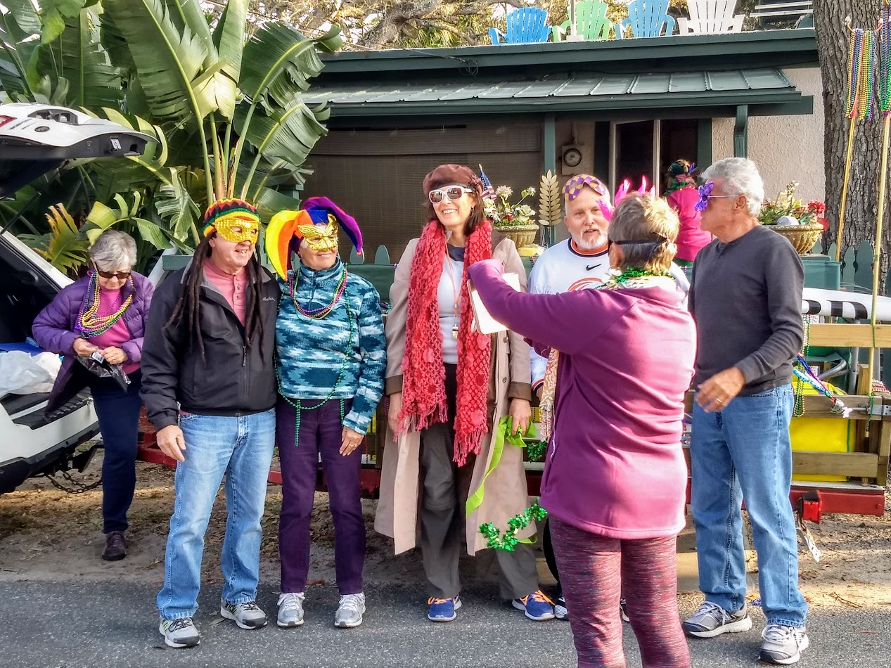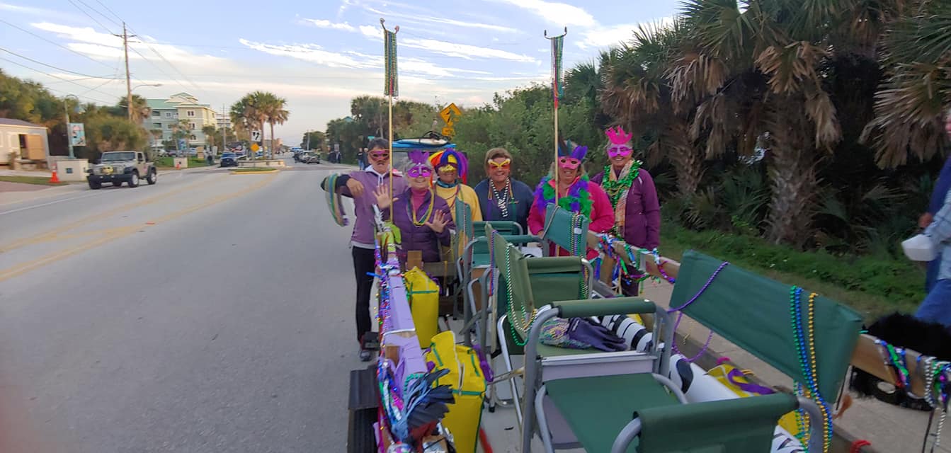 Arlene took some festive pictures of our club’s Mardi Gras attendance. They met at Tom Grubb’s house to decorate the float and then went to the parade which proceeded at 7 pm from S. Atlantic Ave down Flagler to Pine. It was rather cool and brisk last night but Ten (10) members attended. They had a great time tossing beads out to the crowd while representing our CMS Club. It looks like they had a lot of fun!