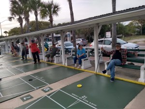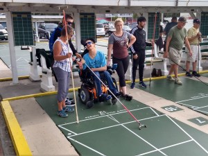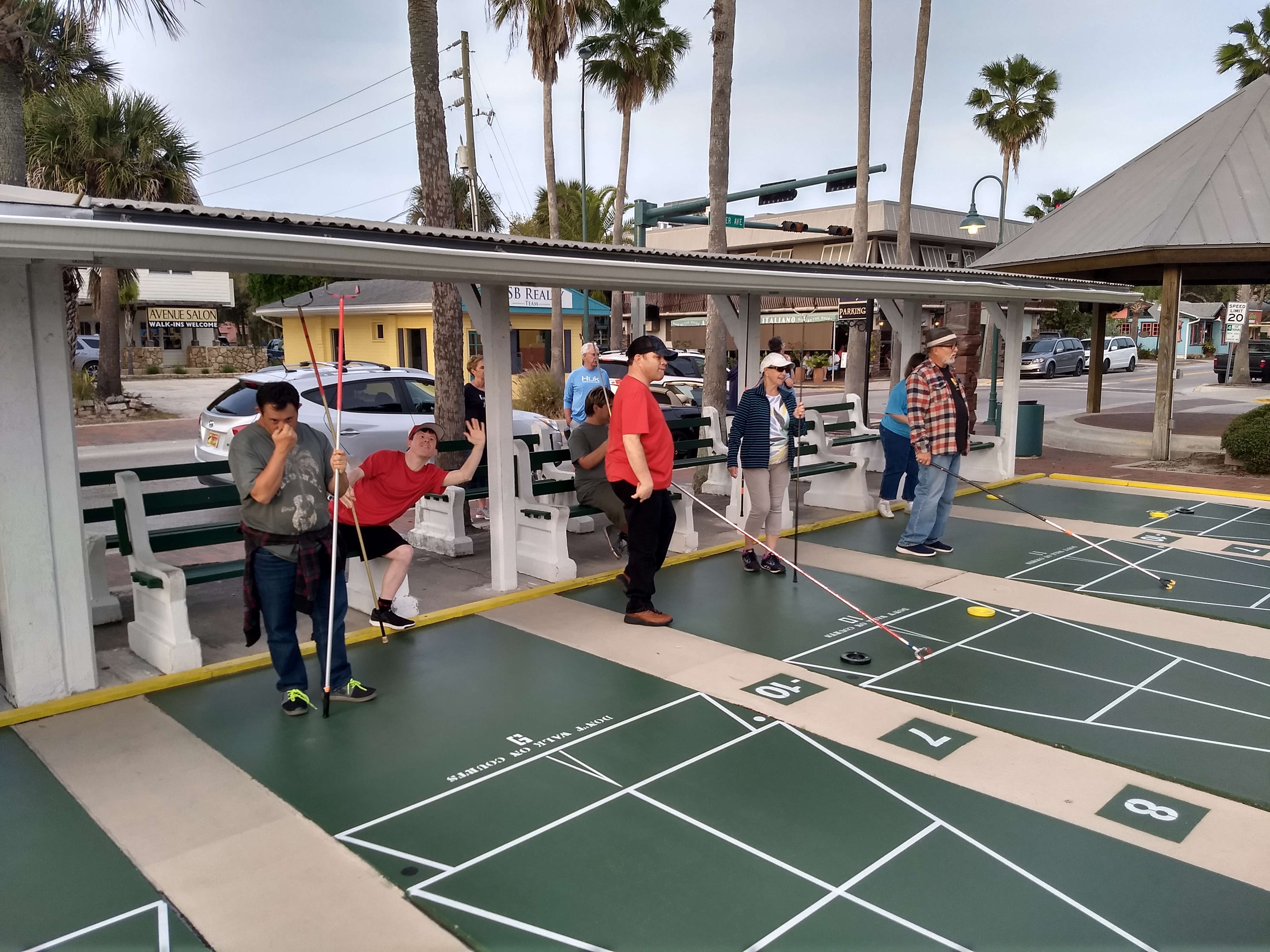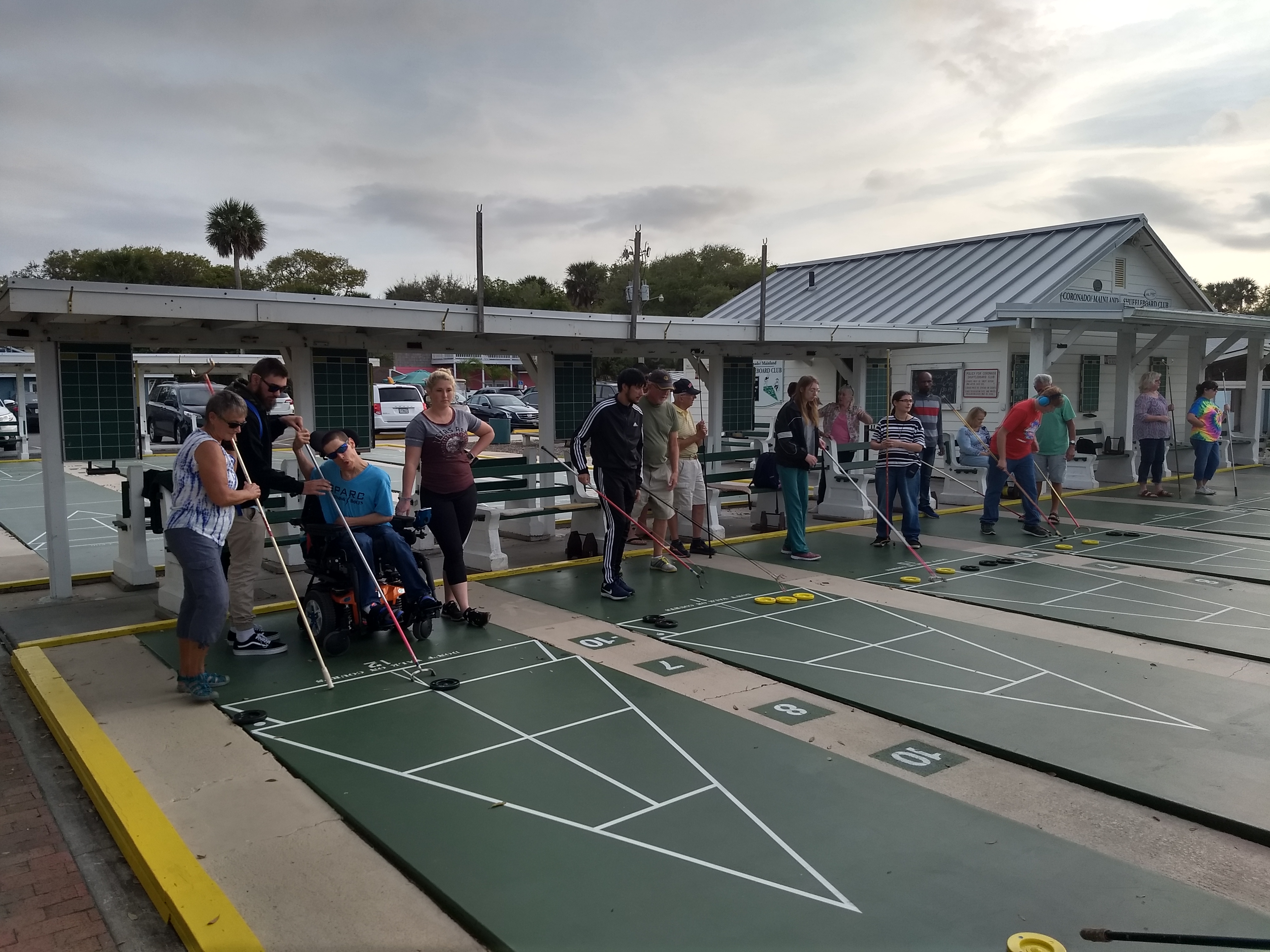 Bill Boyes and our volunteers once again hosted the SPARC group in the evening on Wednesday, Mar 13th. Tom Carbonell was nice enough to forward me some pictures of the “kids” having a whole lot of fun learning how to play shuffleboard. They will be coming every Wednesday evening for the next few weeks. Come on down and enjoy the fun.