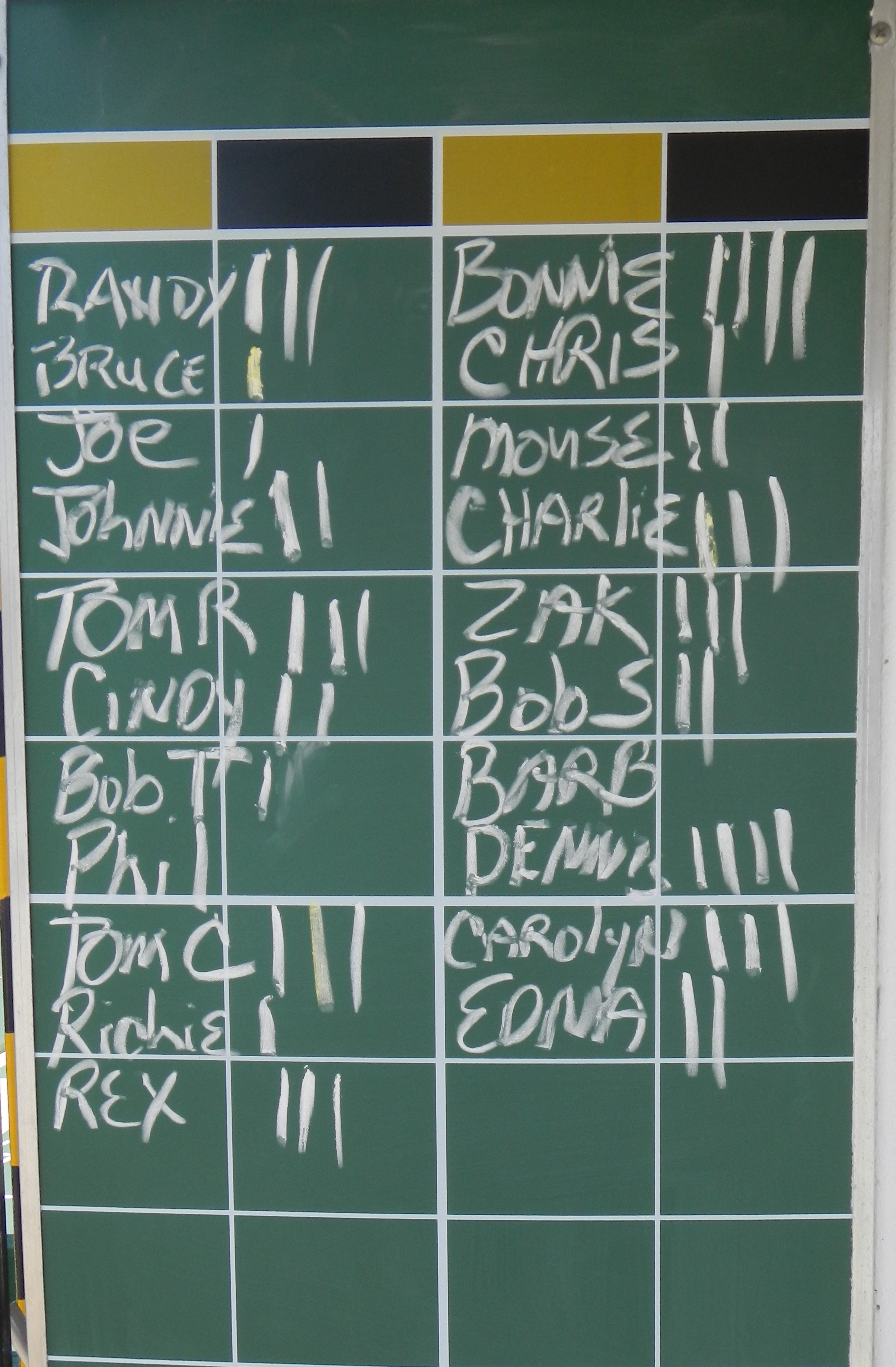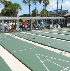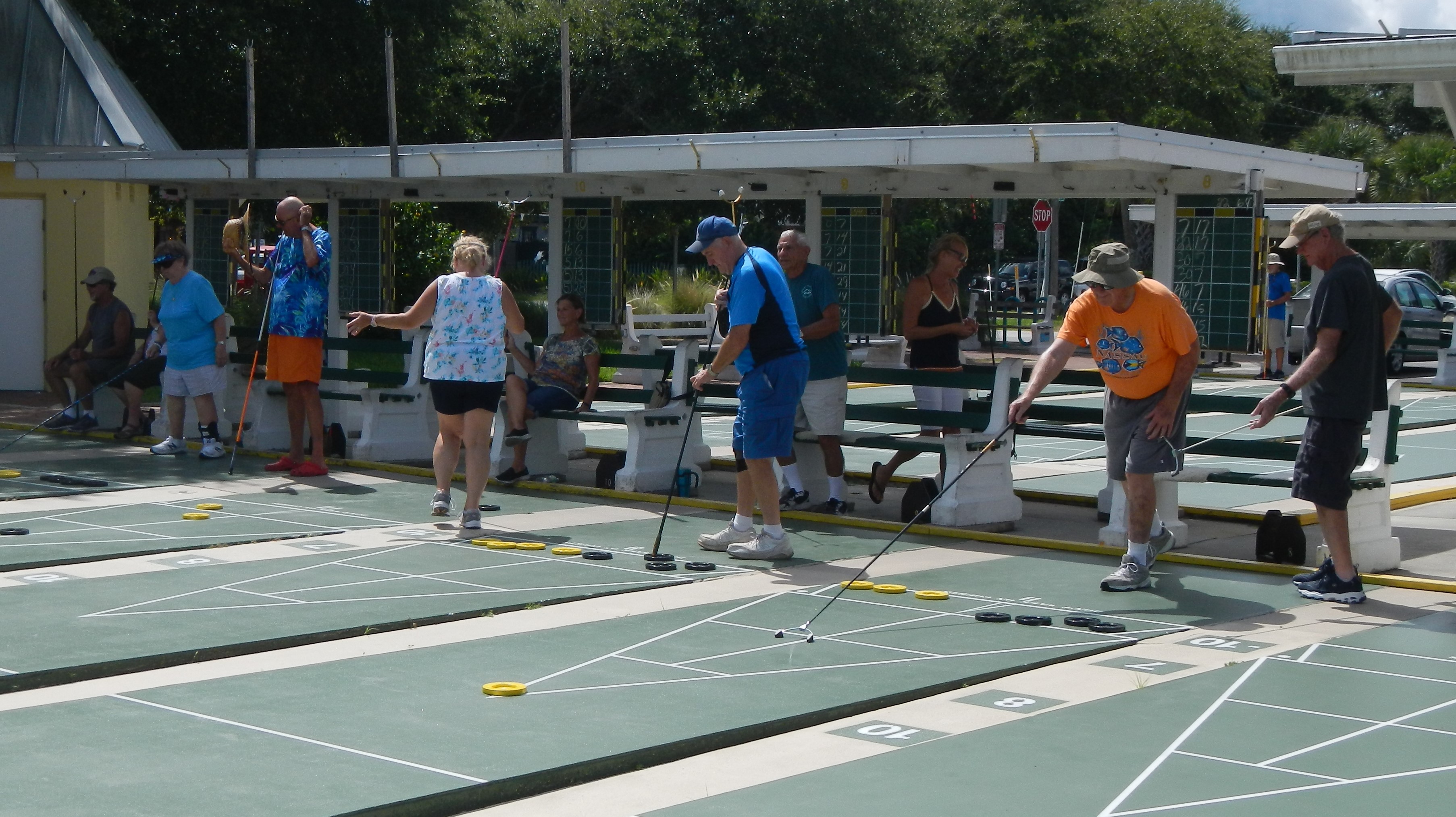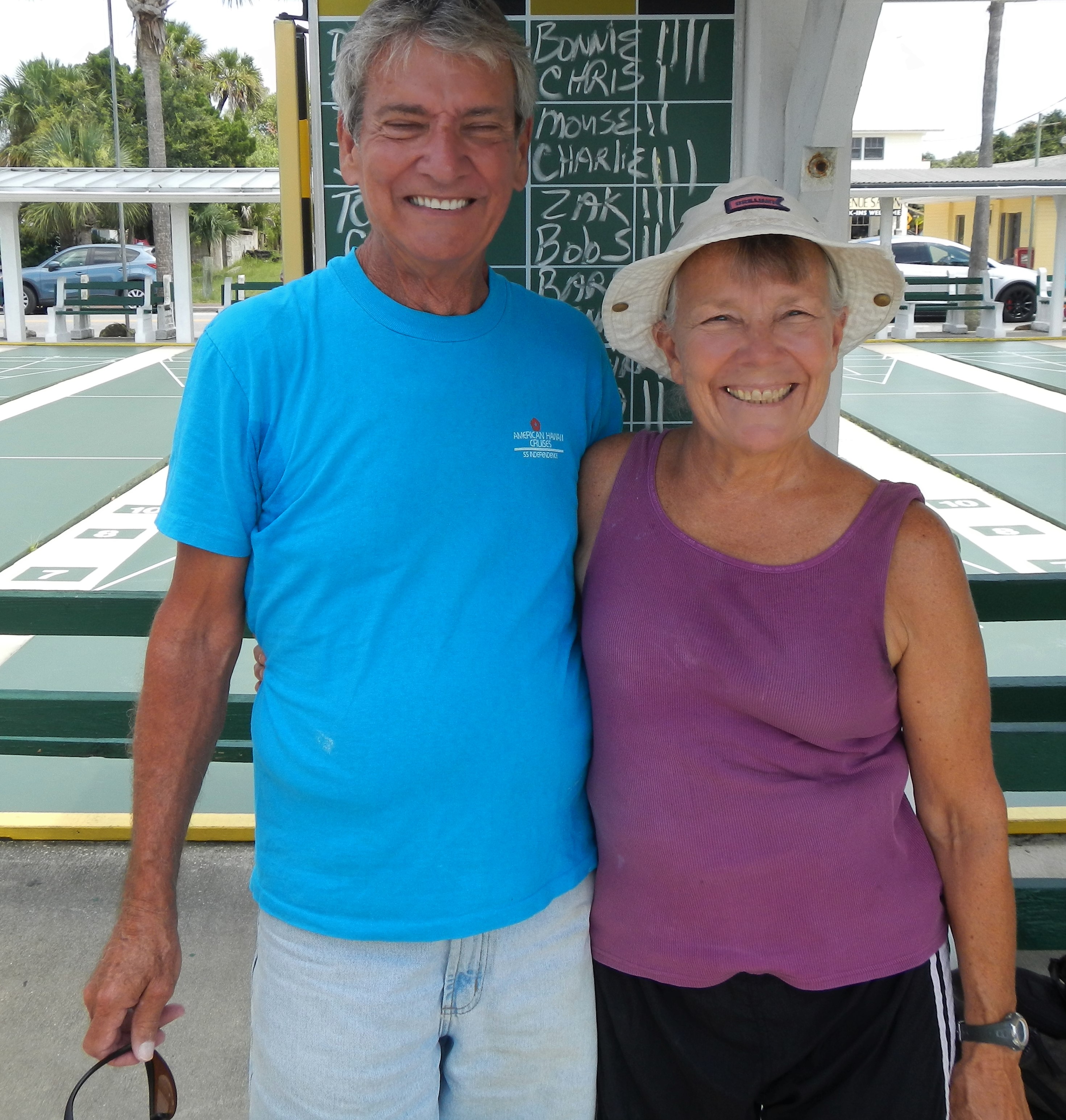 The usual clean up crew arrived to set up the courts for the Thursday Morning Four Play Challenge. Twenty-One (21) shufflers showed up for the challenge. We were pleased to see Richie and Carolyn from Deland here to play. We played four matches recording the winners of each match before drawing for the next match. We congratulate Dennis Buelk and Bonnie Radke for winning all four of their matches. Hope to see you back here again next week for this Thursday challenge. Ciao!