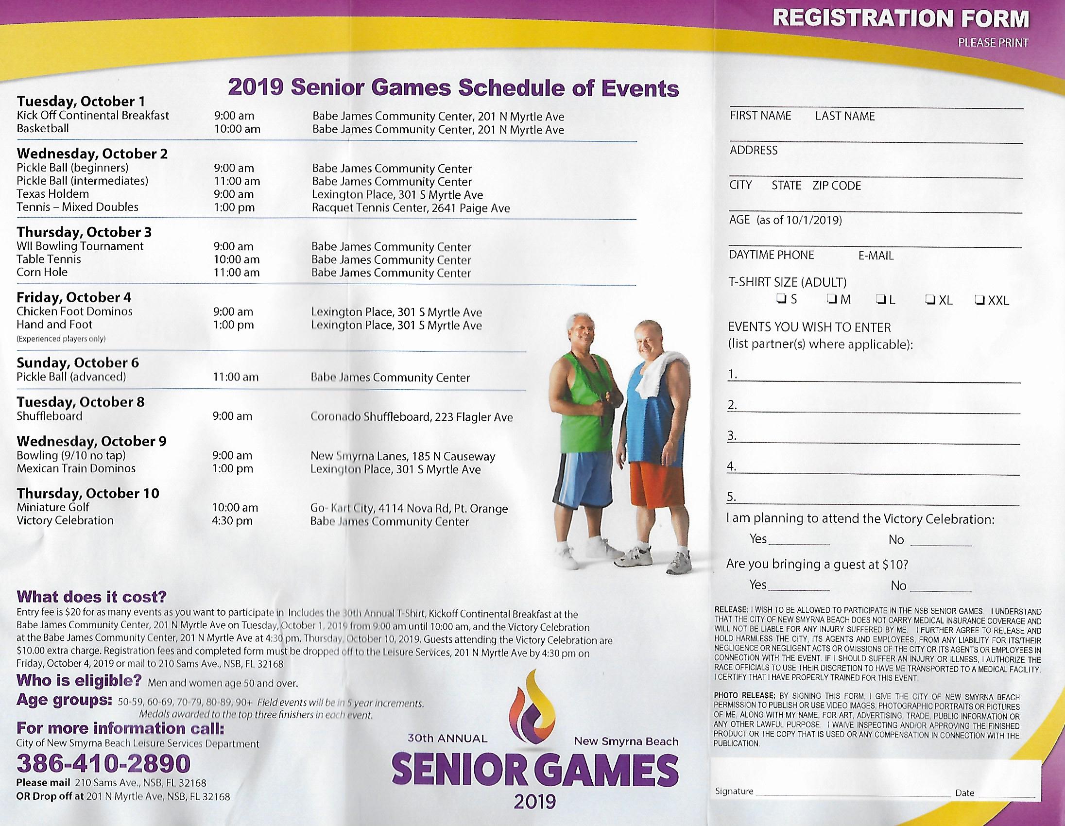 We have the applications for the 30th Annual Senior Games which will take place from Oct 1 – 10, 2019 and is open to anyone 50 years and older. You can get the forms in the Cue House or down load from our page. Please fill it out and mail or take it in to the Leisure Services office at the Babe James on 201 N. Myrtle Ave., NSB. For more information please call 386-410-2890. There will also be a sign up sheet posted next month in the Cue House for anyone who would like to volunteer to help on Tuesday, Oct 8th for the Shuffleboard Senior Games. Thanks for your assistance.