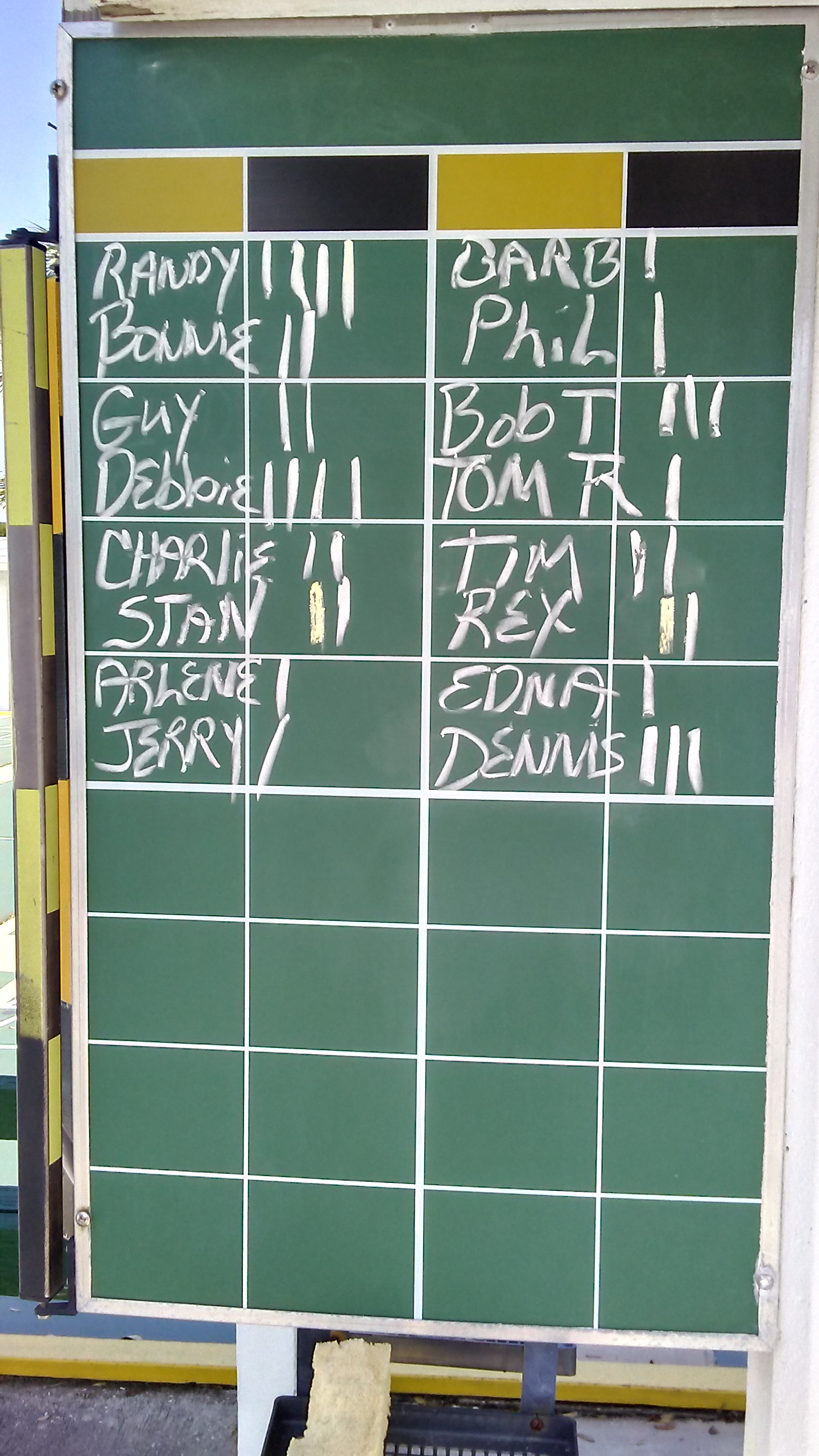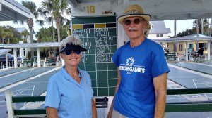 The usual clean up crew arrived to clean and set up the courts for the Thursday Morning Four Play Challenge. Sixteen (16) enthusiastic shufflers showed up to meet the challenge and prepare for the upcoming tournament season starting Oct. 3rd in Deland. Randall and Rita Harman stopped by the courts to say hello to everyone and thank us all for our good words and prayers for Darrel Harman. Congratulations to Debbie Evans and Randy Radke for winning all four of their matches. We have only two more weeks left this season to play the Thursday Morning Challenge, so come on down. Ciao!