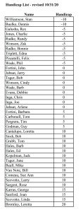 We are now playing Saturday Shuffleboard games using a handicap scale. Please see the attached sheet of assigned handicaps. This is an updated handicap list and we have new handicap cards for everyone.