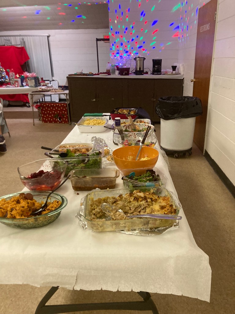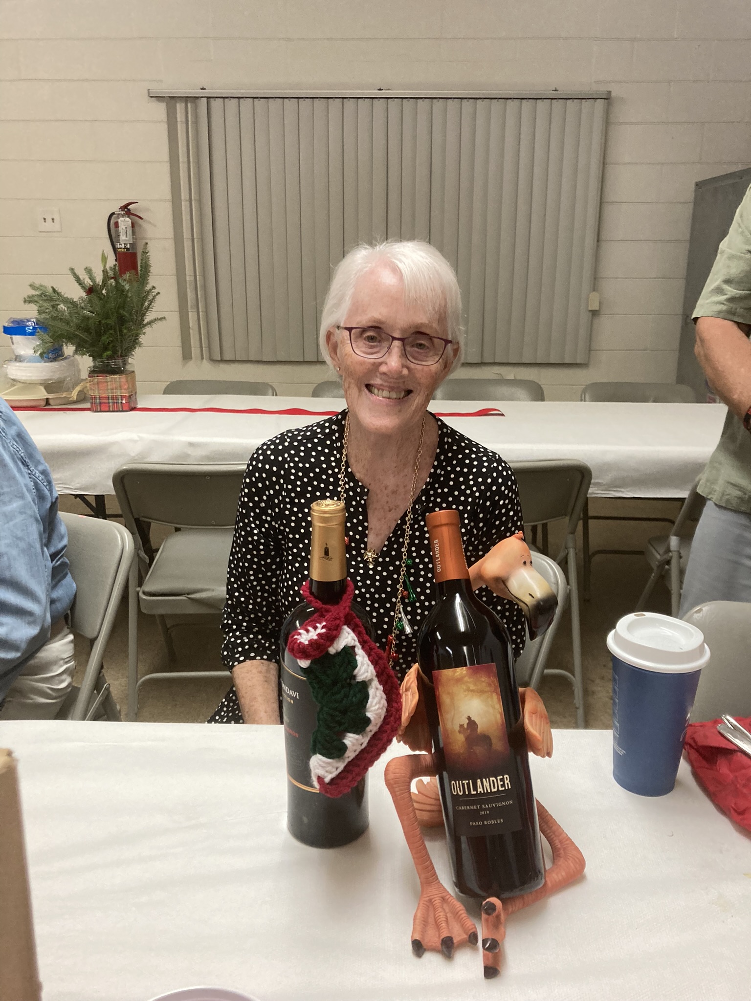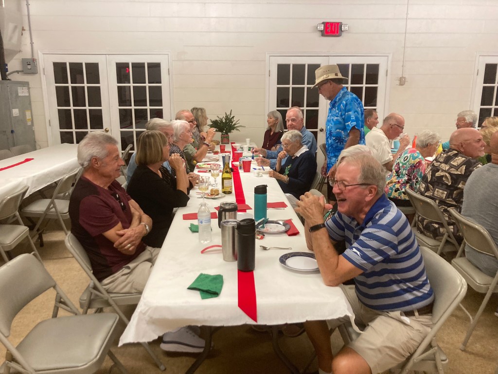 We had approximately 46 people sign up to join us for a very enjoyable evening. We began around 5:00 pm with socializing, a party light-flashing ball with Christmas music (which Suzanne brought) and the prayer by Janet Shira. First we enjoyed a fantastic dinner with so much good food and once the tables were cleared, we began with a riotous Yankee Swap with numbers being drawn, presents being swapped and re-swapped. The wine looked like the most popular gift with a Champion Shirt as a second. There were many nice gifts. Suzanne documented the whole event and took selfies with everyone.