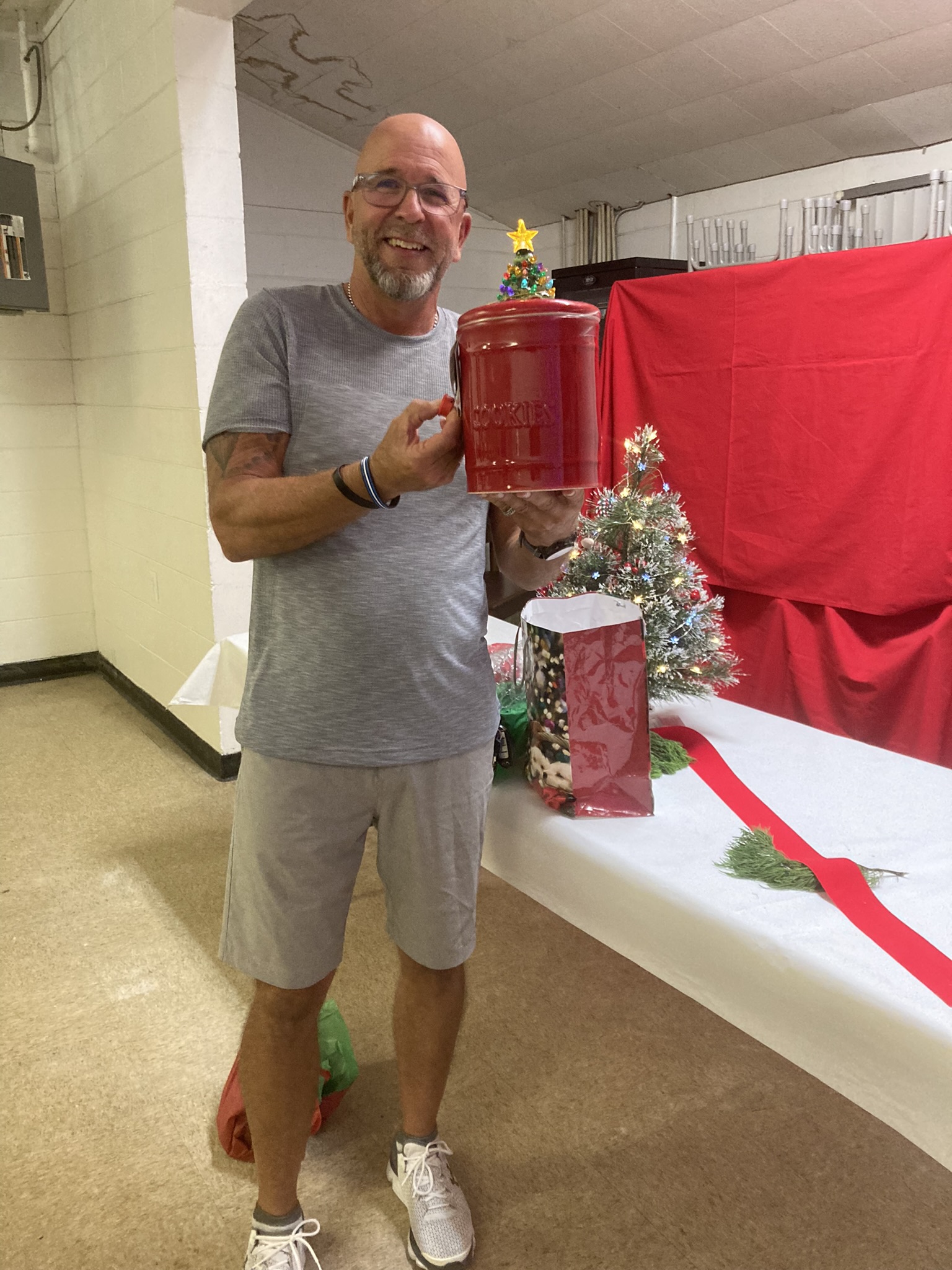 Once the last swap was made Arlene had wrapped two door prizes. The first one was drawn by Joan Sanford. It was the cutest ceramic flamingo holding a wine bottle. The second door prize was won by Mark Gephart and it was a ceramic cookie jar with an LED light up Christmas Tree on the top. He was a lucky man as he also won the 50/50.