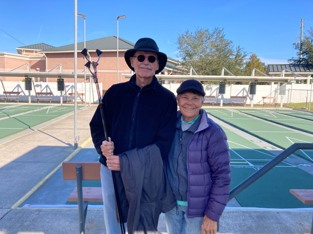 Once again the rain tried to stop our tournament. We were delayed until Friday, Dec 16 and Sat. Dec 17. We had 19 teams sign up to play and Rich and Caroline Burrell were the Directors. The Deland Shuffleboard club was the sponsor for this tournament. This was a 16 frame/75 point tournament and many of the contestants finished on Friday. Therefore I do not have many pictures of the winners. Congratulations to all the players, especially those who identify as Coronado Mainland shufflers.