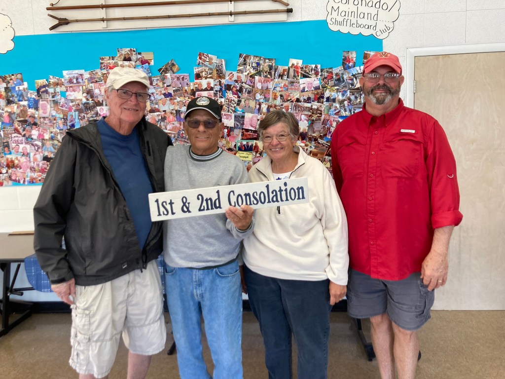 The Coronado Mainland Shuffleboard Court hosted the ND24 No Two Pros Tournament on February 2nd and 4th. The finals were delayed until Saturday due to rain. Cindy and Zak Wonson were the Directors and H2Health, Tina Pritchard Realtors, SpringHill Suites, G&W Roofing, Preston Law Firm, Todd Perry State Farm,Davis Bros HVAC, Cindy&Zak Wonson, Jerry&Arlene Jabaut, Gail Kadar, Janet Shira, Nancy Grummer were our sponsors. We had 19 teams come for the challenge and thanks to all our wonderful volunteers the tournament was a great success. Congratulations to all the shufflers especially those who identify with Coronado/Mainland.