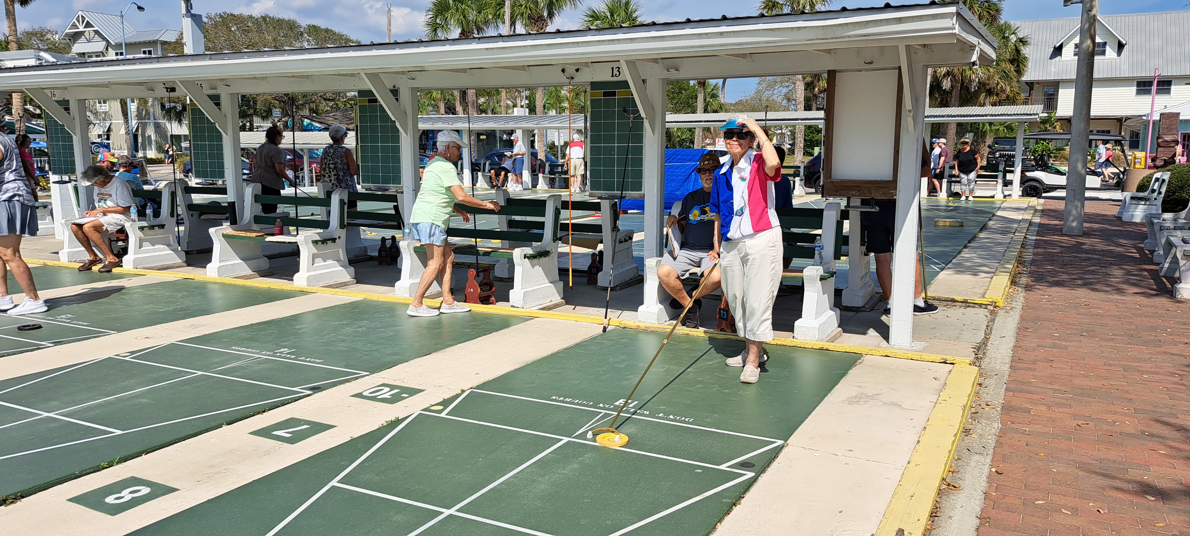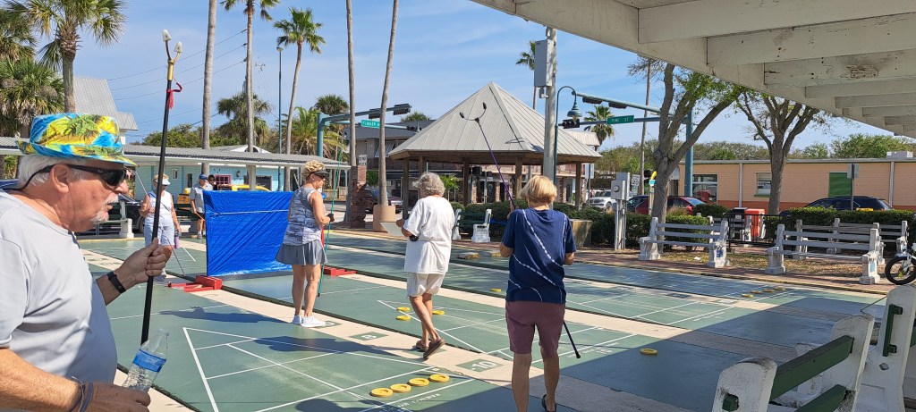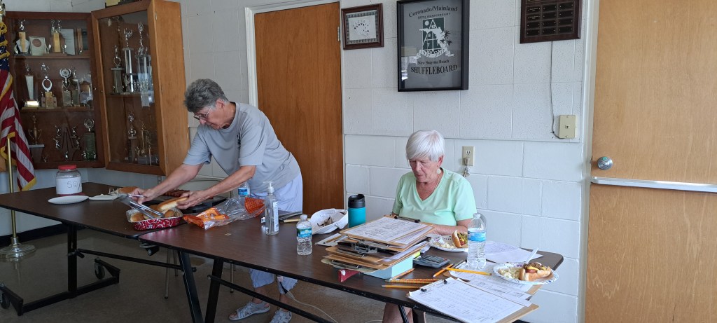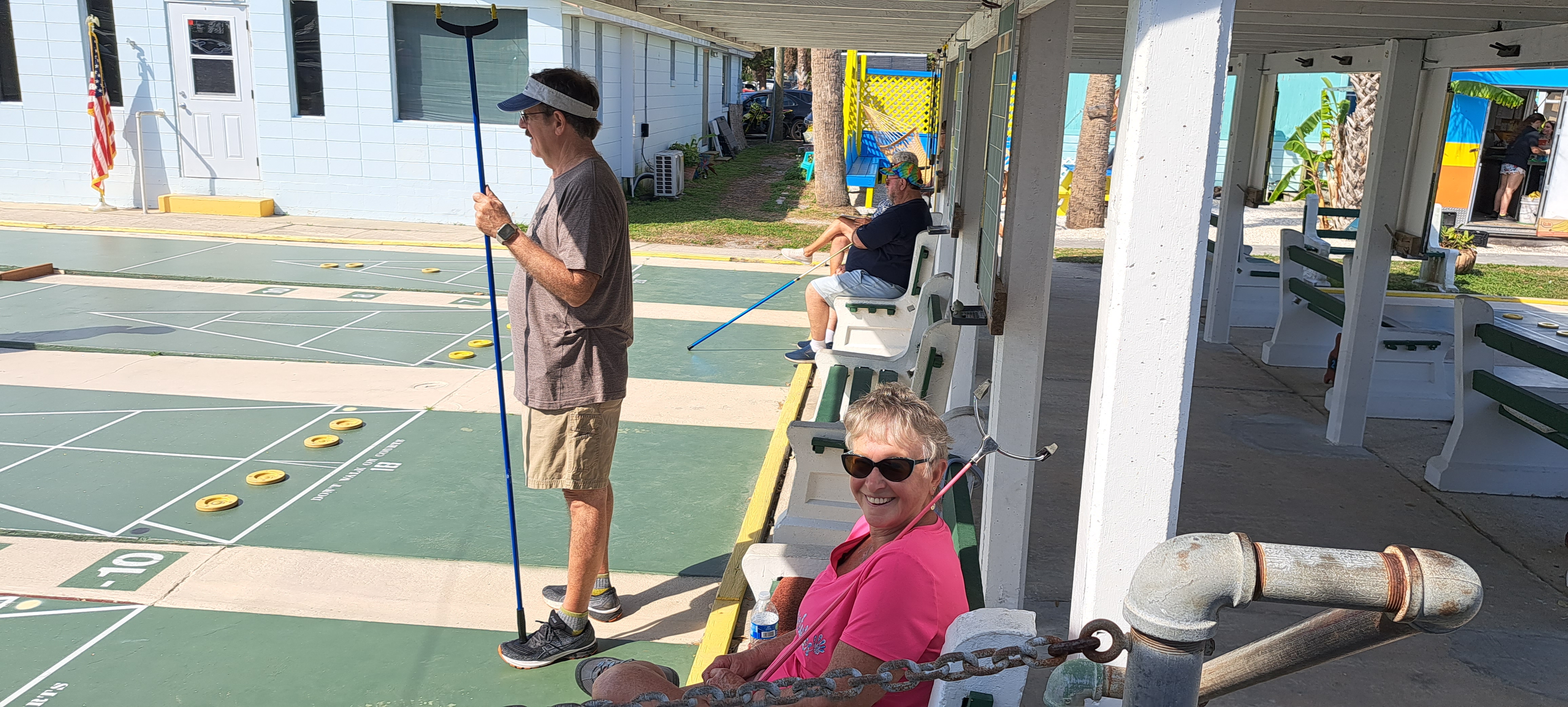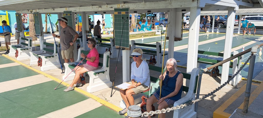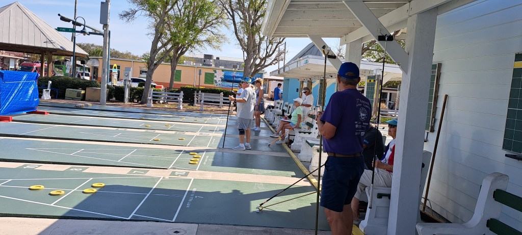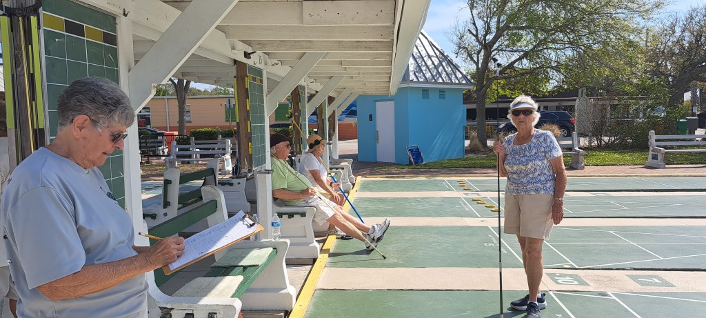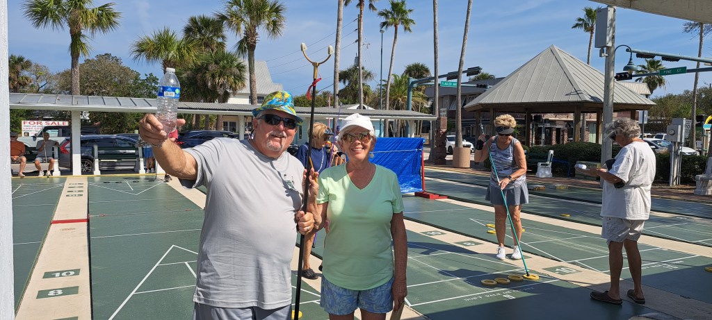 John and Barb Fortini as well as many others set up and organized the Fun Day Competition today. They had 48 people show up for the challenge. All 20 of our courts were set up with obstacles and teams were set up with a captain and three or four members. Congratulations to all the Shufflers.