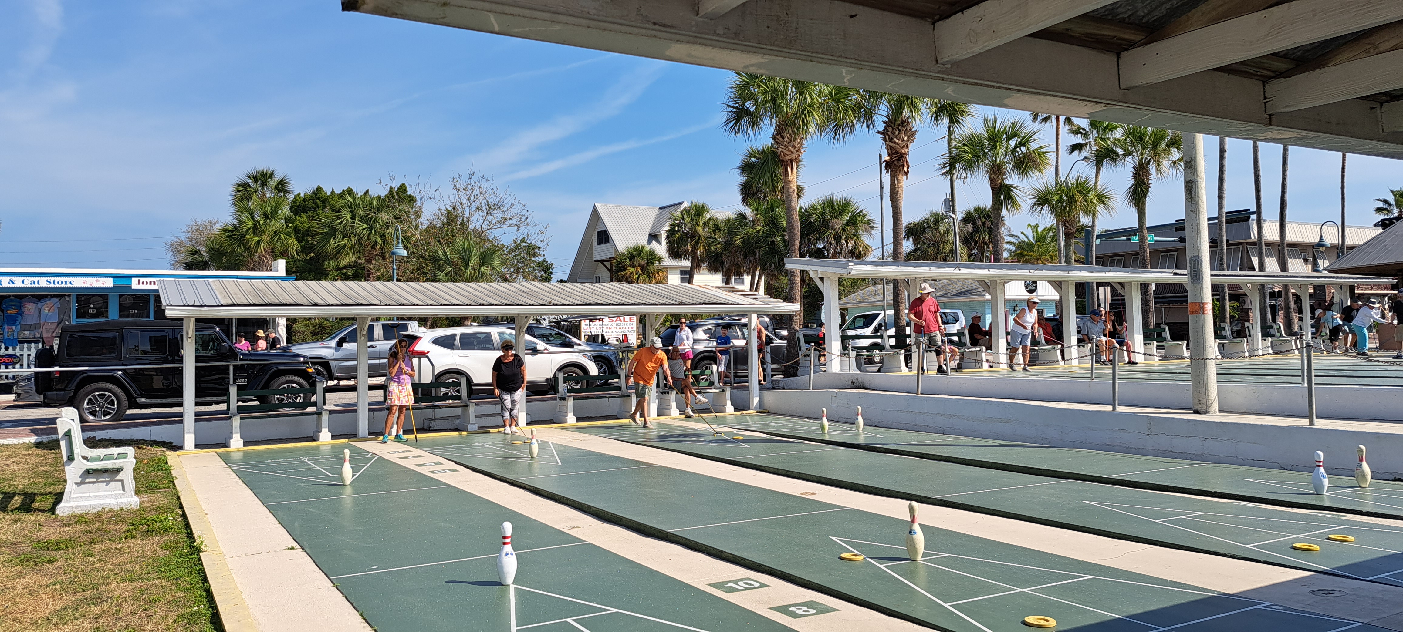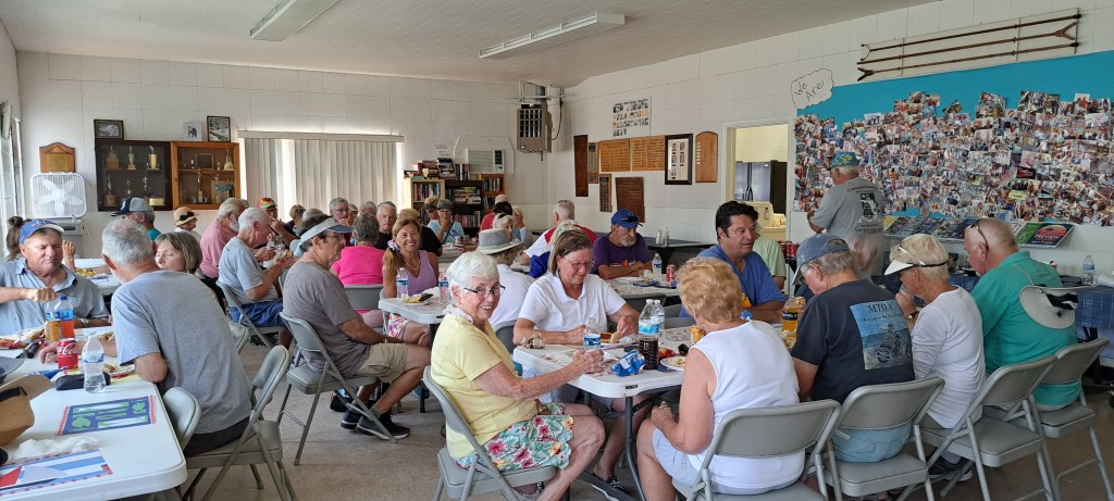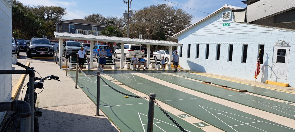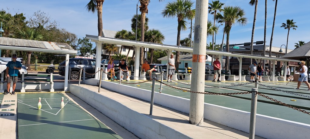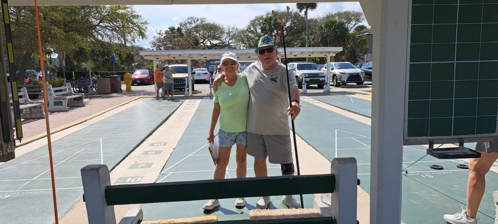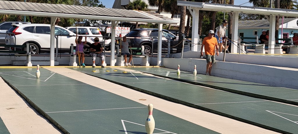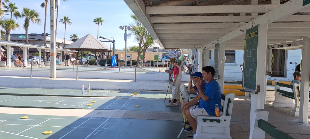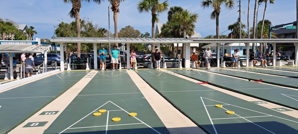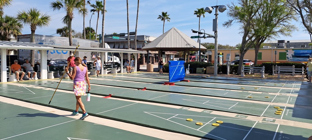 John and Barb Fortini as well as many others set up and organized the Fun Day Competition today. They had 48 people show up for the challenge. All 20 of our courts were set up with obstacles and teams were set up with a captain and three or four members. Congratulations to all the Shufflers.