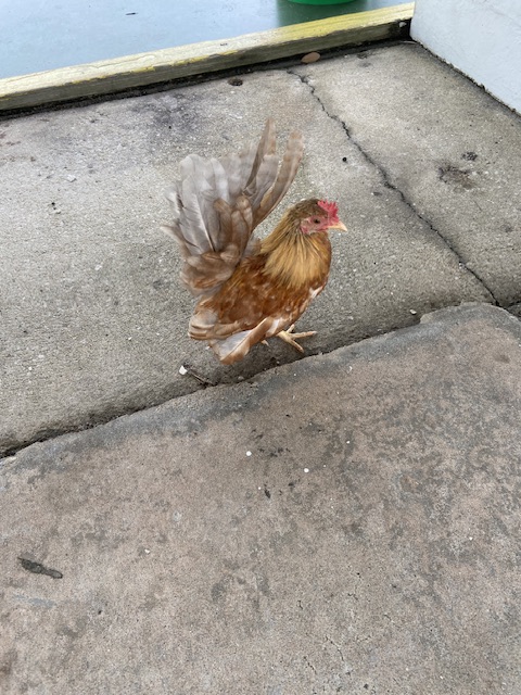 Friday morning we had a new little chicken at the courts. When they opened the door to the cue house he came popping out! Be careful when you close up that “everyone” is out. He stayed with us the whole morning for protection from the big roosters. Hope he is still ok!
