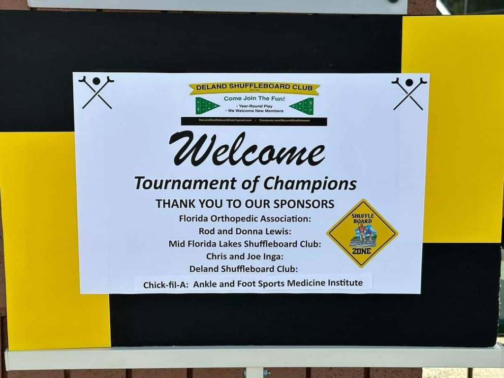The Deland Shuffleboard Club sponsored the Northern District Tournament of Champions on March 7 and 8. The courts were in wonderful condition and the weather was great. Rod Lewis and Richie Burrell were the directors. The sponsors were: the Sanborn Center, Deland Shuffleboard Cub, Mid-Florida Lakes SBC, Florida Orthopedic Association, Ankle & Foot Sports Medicine Institute, Chick-fil-A, Joe and Chris Inga and Rod and Donna Lewis. The Deland Shuffleboard Club also presented each winner in their category with a Commemorative Gold Disc. Congratulations to all our shufflers.