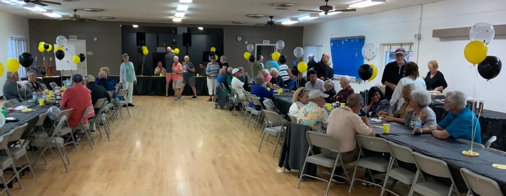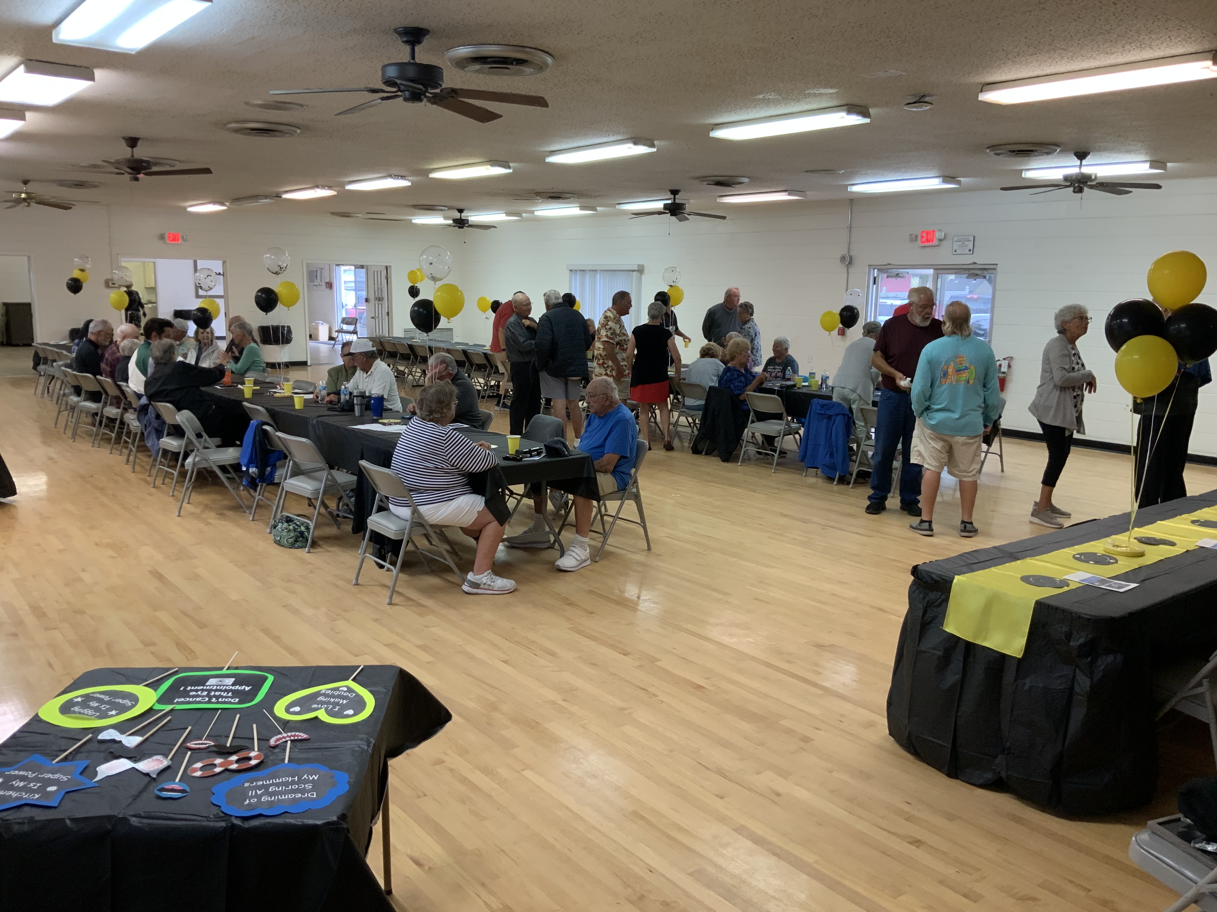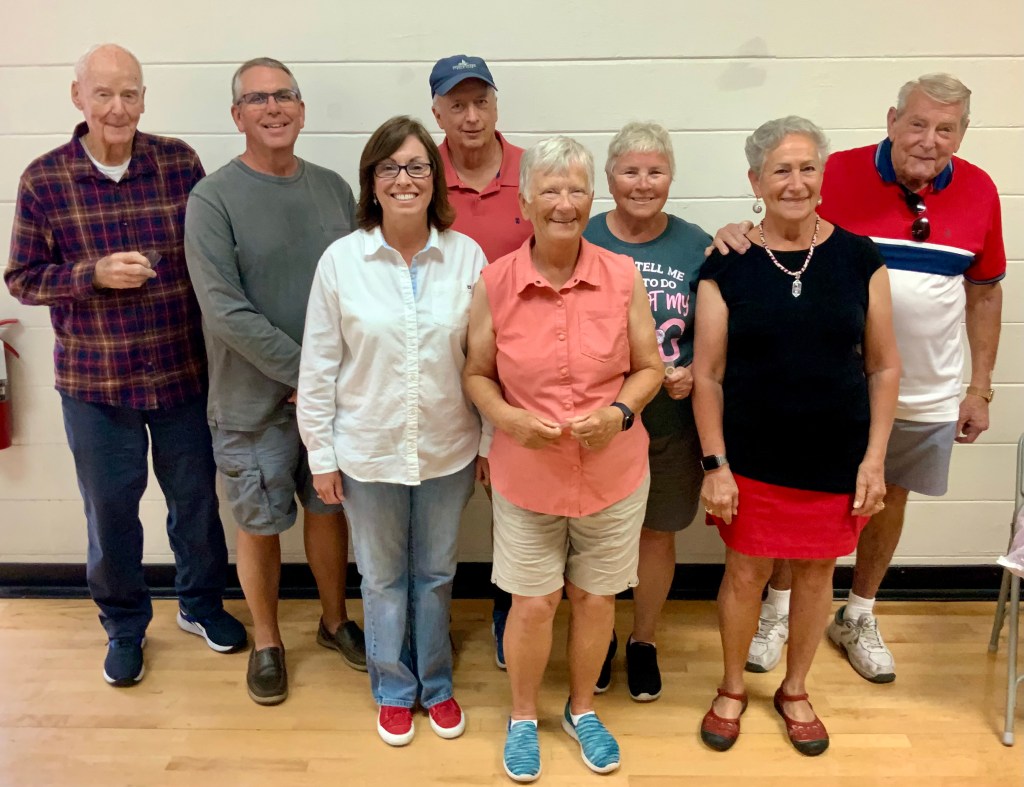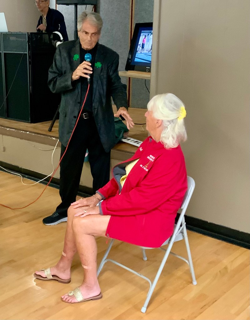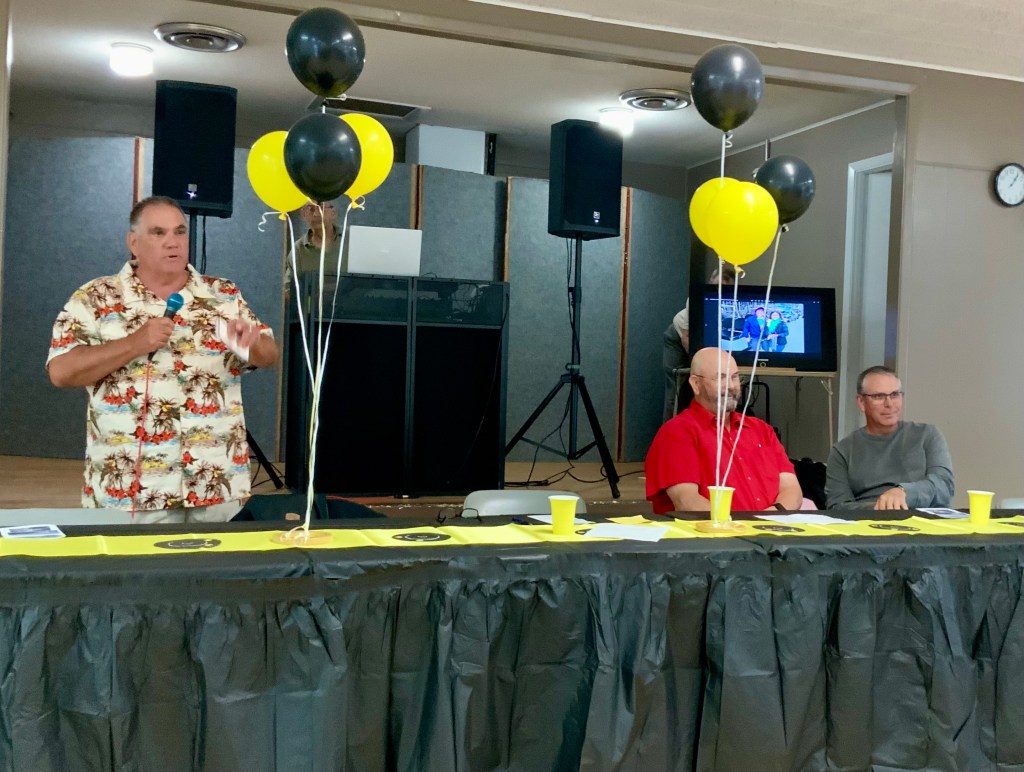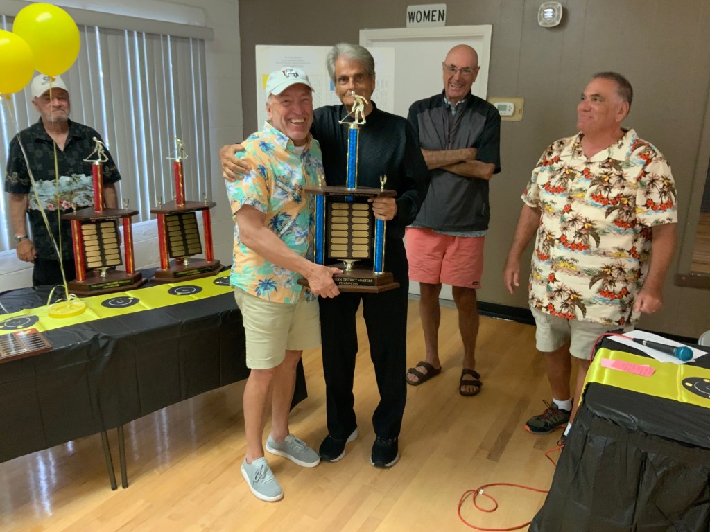 People were having their pictures taken with goofy shuffleboard expression props. Then our Master of Ceremonies and Club Crooner, Stan Williamson, took over the microphone and presented memento trophies to Bob Tager and Zak Wonson as well as a photo of an actual compilation representing 65 total points in one frame. He also entertained us and serenaded Gail Howell with songs from Tom Jones and “The Soul Train”. Everyone had a great time. Thanks to all who made it possible.